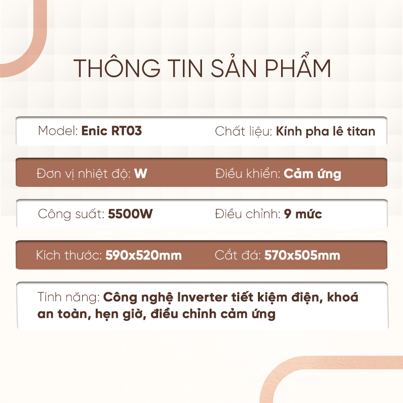 Tối ưu hóa khả năng nấu nướng đa nhiệm với Bếp từ cảm ứng 3 vùng nấu Enic RT03 – một Thiết bị nhà bếp tiên tiến, hoàn hảo cho những gia đình có nhu cầu nấu nướng thường xuyên. Với thiết kế 3 vùng nấu độc lập và công nghệ Inverter tiết kiệm điện, RT03 mang lại sự tiện nghi và hiệu quả cao.
