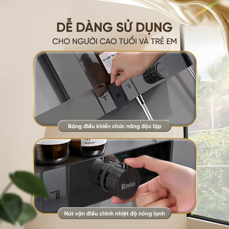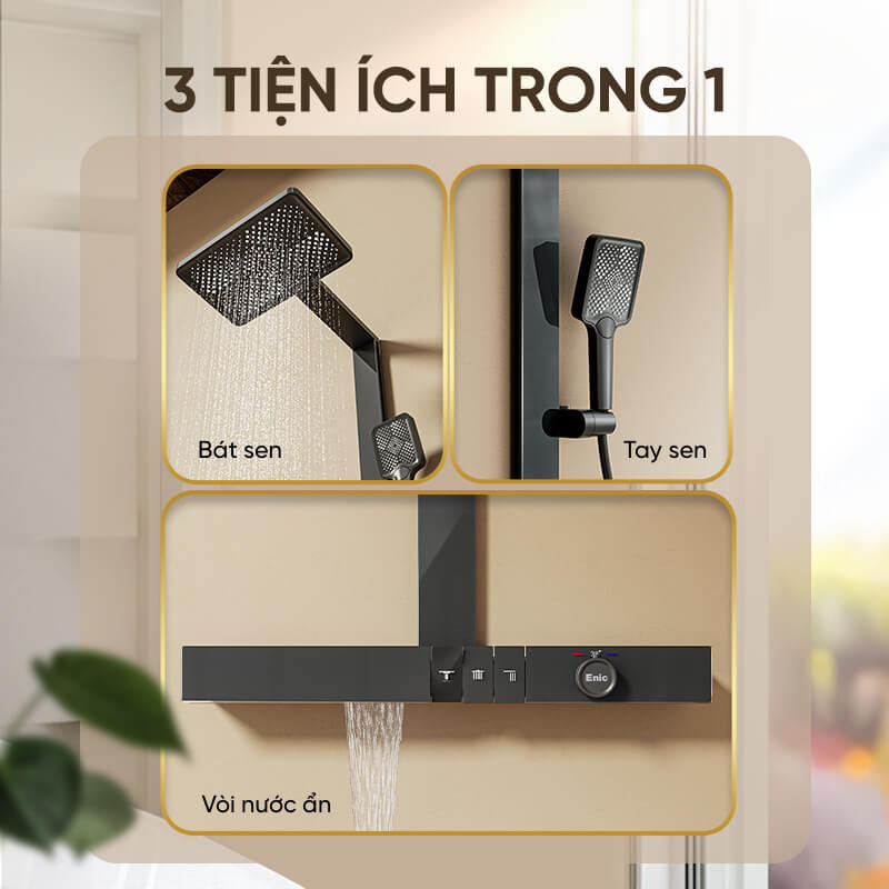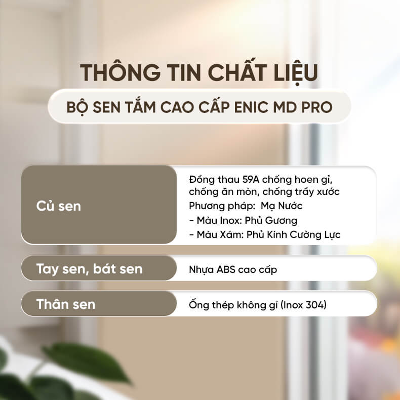 Bộ sen tắm cao cấp Enic MD pro có 2 màu sắc hiện đại: màu xám và màu Inox. Mang đến vẻ đẹp sang trọng, thu hút, nổi bật cho không gian phòng tắm, sự đa năng và bền bỉ theo thời gian cho người sử dụng.