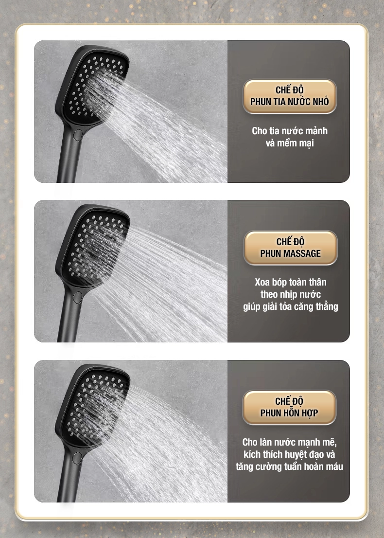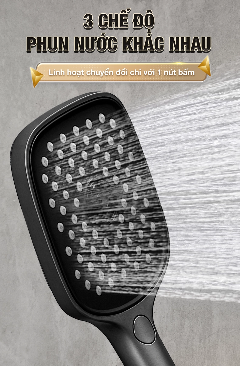 - Tay sen chuyển đổi 3 chế độ phun nước linh hoạt chuyển đổi chỉ với 1 nút bấm (chế độ phun tia nhỏ mảnh, chế độ phun xoa bóp massage toàn thân, chế độ phun hỗn hợp cho làn nước mạnh mẽ, tăng tuần hoàn máu)