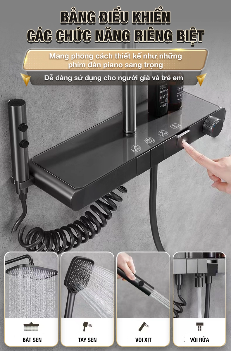 - Nút điều khiển 4 trong 1 dễ dàng cho trẻ em và người già sử dụng (bát sen, tay sen, vòi xịt, vòi rửa)