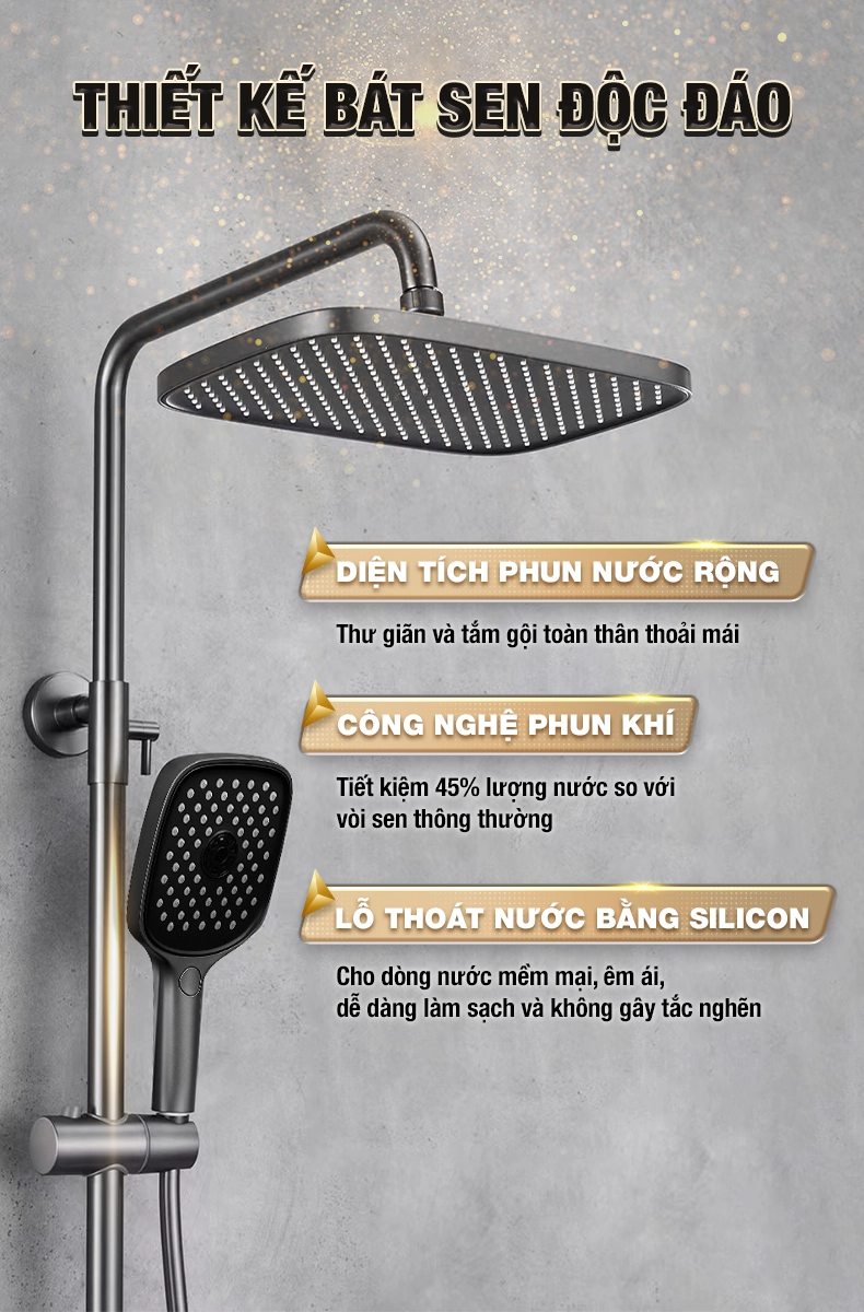 - Công nghệ phun khí tiết kiệm 45% lượng nước so với sen thông thường
