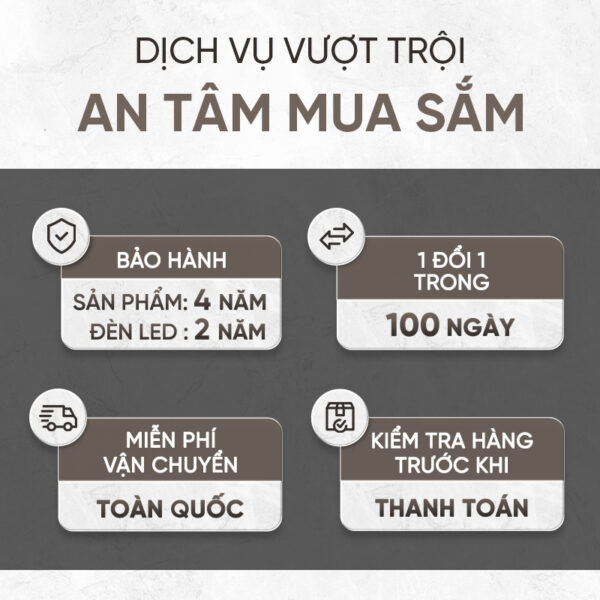 Mk mới đặt mua tuần trc mà nay có mấy bn nhân viên bên này qua lắp đặt luôn rồi nè, thấy giao hàng lắp đặt chuyên nghiệp lắm, mà nhà mk lắp là còn không mất phí j luôn ấy. Trước mắt cảm quan là mẫu mã đẹp mắt và hỗ trợ nhiệt tình. Còn về sd lâu dài thì để trải nghiệm 1 tg xong mk quay lại đánh giá tiếp nha