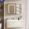 - Chất liệu lavabo: Lavabo được làm từ đá nhân tạo kết hợp với sơn phun bề mặt mịn màng, mang lại cảm giác sang trọng và dễ dàng vệ sinh.