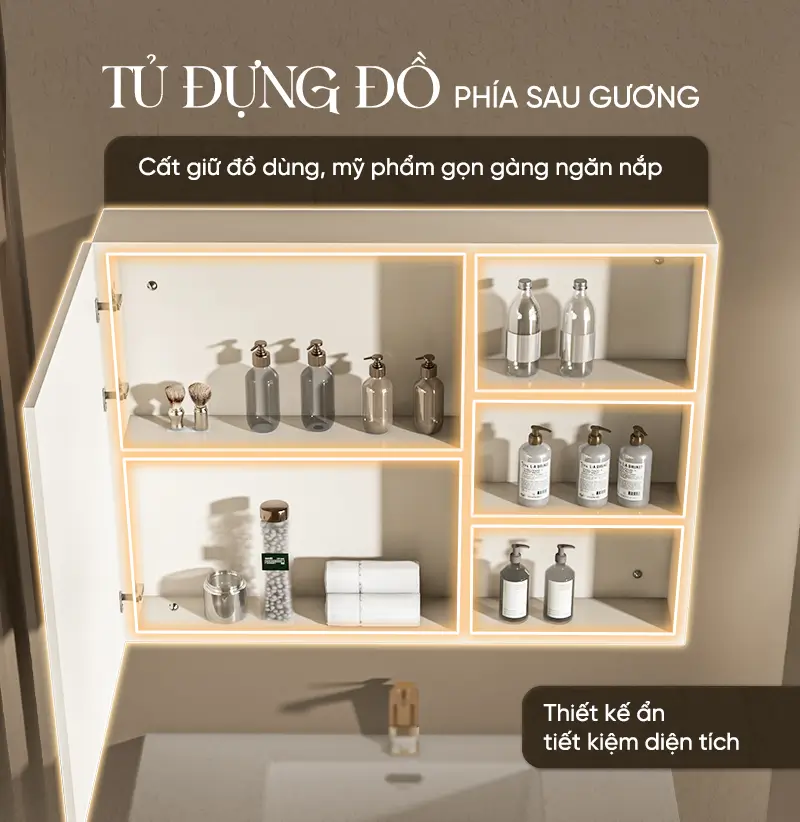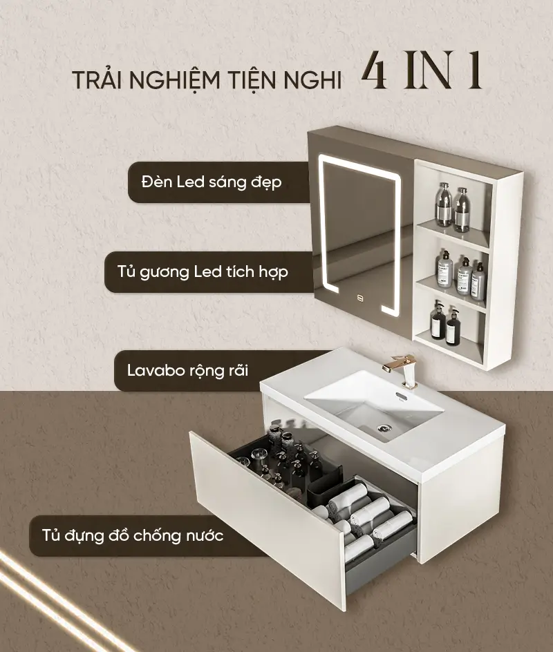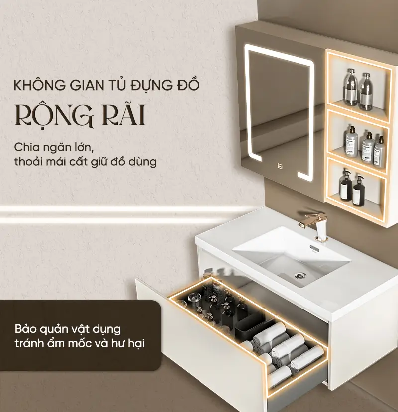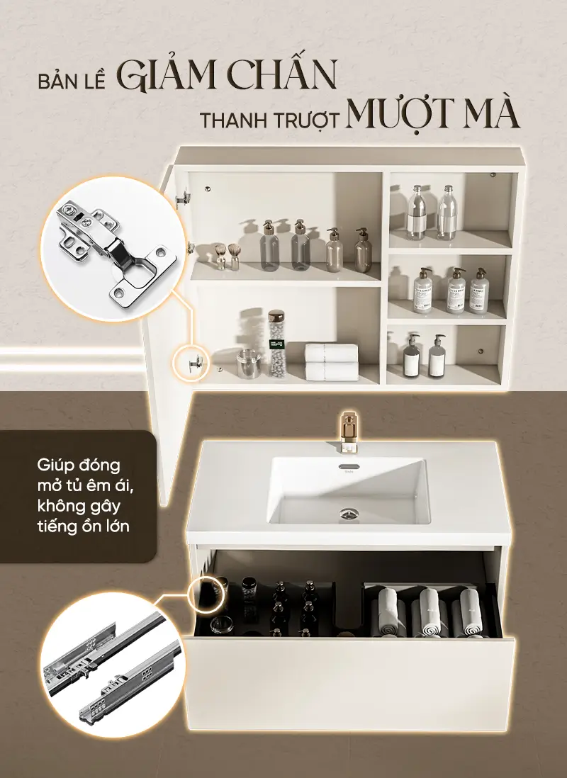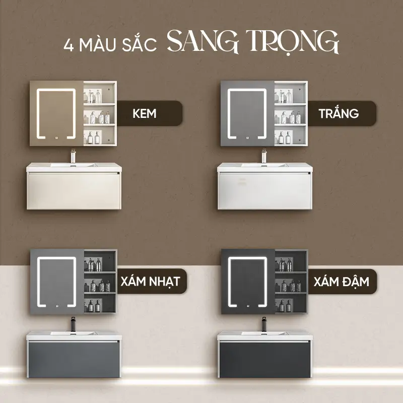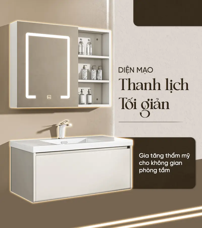 - Thiết kế hiện đại, tiện dụng: Bộ tủ phòng tắm được chia ngăn khoa học, giúp tăng diện tích lưu trữ và sắp xếp đồ dùng ngăn nắp. Giải pháp tối ưu cho phòng tắm luôn gọn gàng và tinh tế.