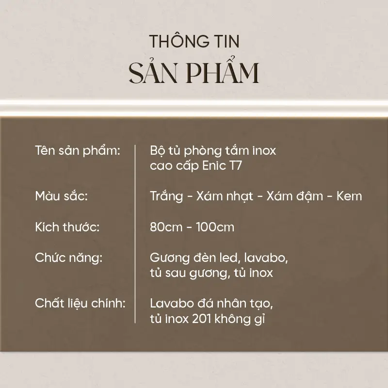 Bộ tủ gương lavabo phòng tắm inox cao cấp Enic T7 là sự kết hợp giữa thiết kế hiện đại và chất liệu cao cấp, mang đến sự tinh tế và tiện nghi cho không gian phòng tắm của bạn.