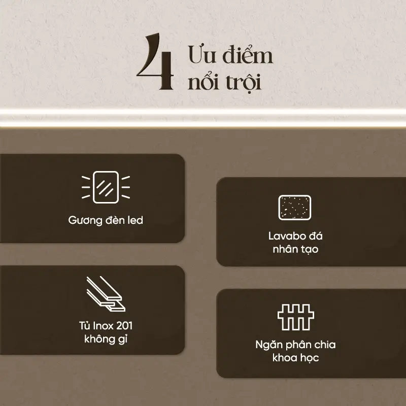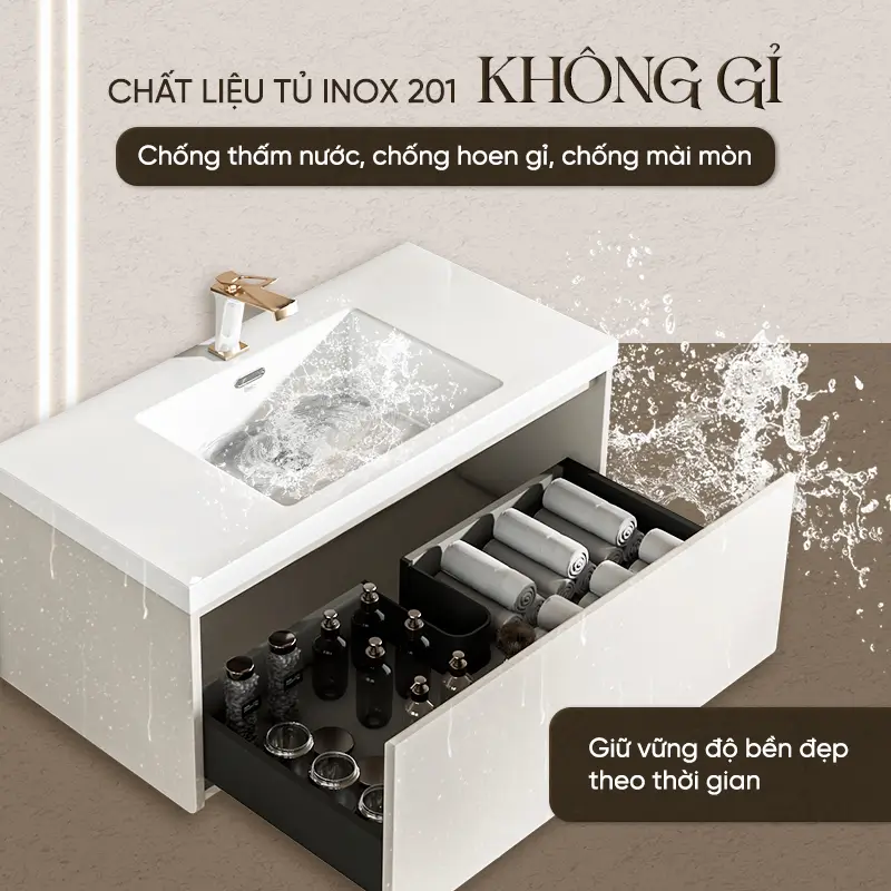 - Chất liệu bền bỉ: Tủ lavabo được làm từ inox 201 không gỉ, có khả năng chống oxy hóa, chống thấm nước tối ưu, phù hợp với môi trường ẩm ướt của phòng tắm. Lavabo đá nhân tạo kết hợp sơn phun bề mặt tạo độ bóng mịn sang trọng, chống bám bẩn, dễ lau chùi.
