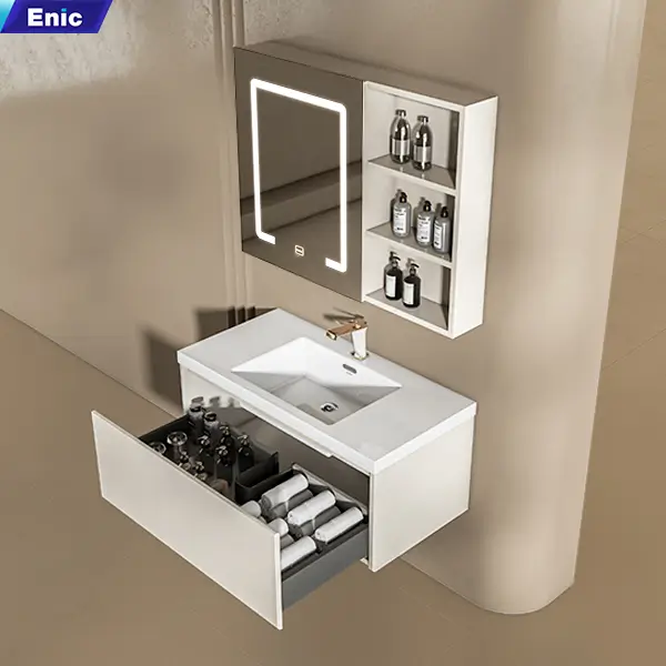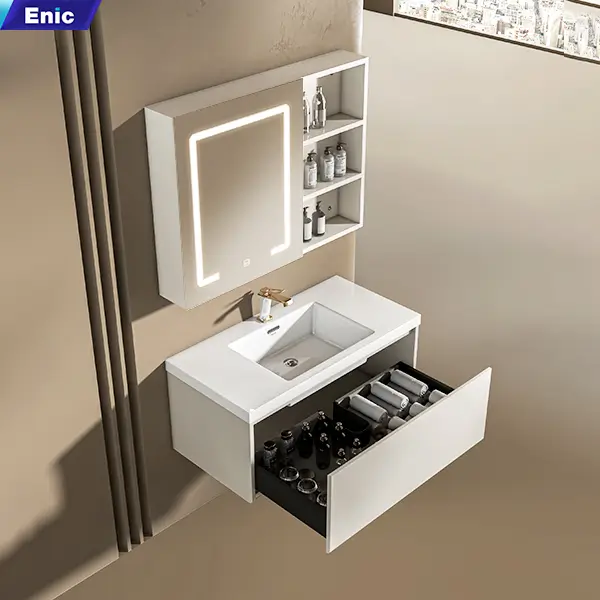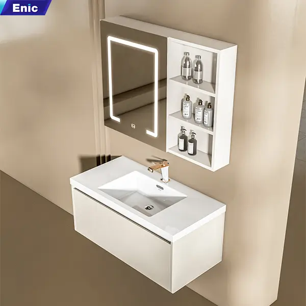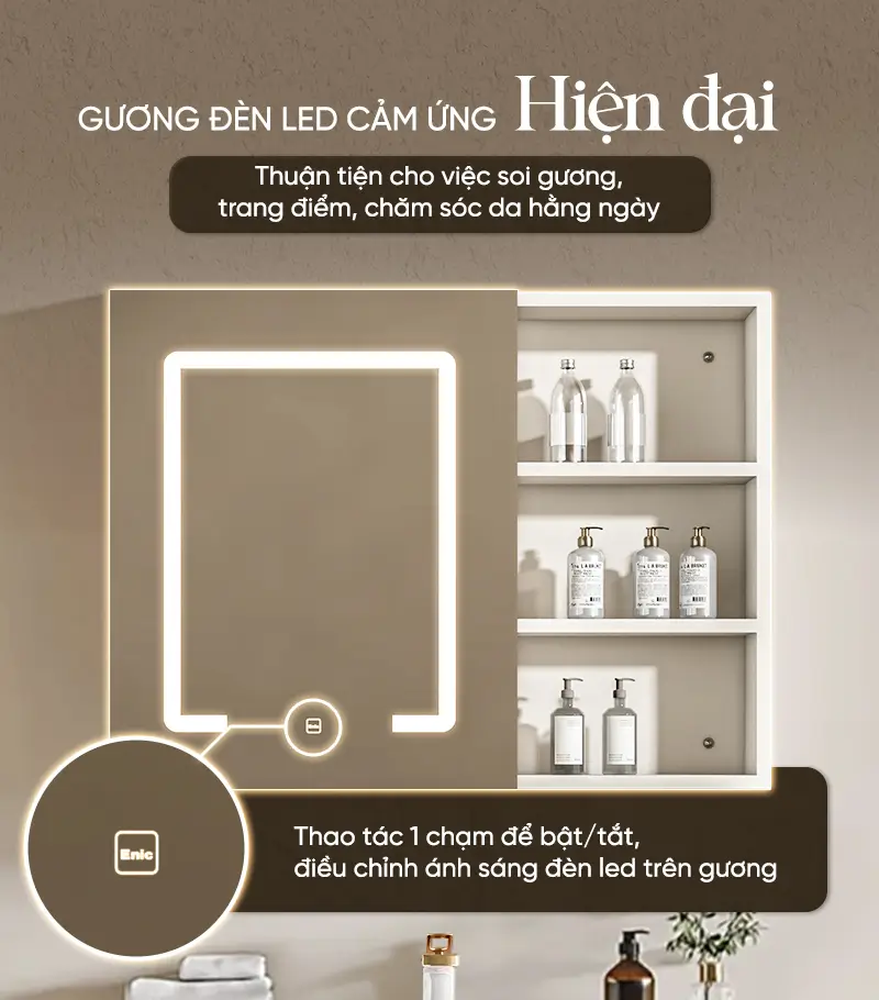 Enic uy tín đó giờ trên thị trường rồi nên mình yên tâm về chất lượng, nhận lắp xong đẹp, ưng hết ý. m phải lên đánh giá ngay, mặt đá sứ trắng, bóng sáng, gương đèn cảm ứng nhạy , sáng vừa phải khoongolafm chói mắt, tủ rộng rãi, tủ không đơn giản nên có dơ vệ sinh dễ