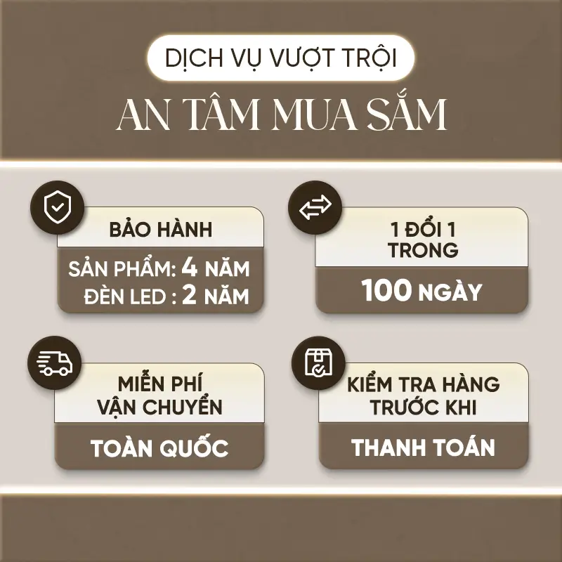 Bảo hành lên tới 4 năm – Cam kết chất lượng vượt trội. Vận chuyển và lắp đặt tận nhà, tiện lợi và nhanh chóng.