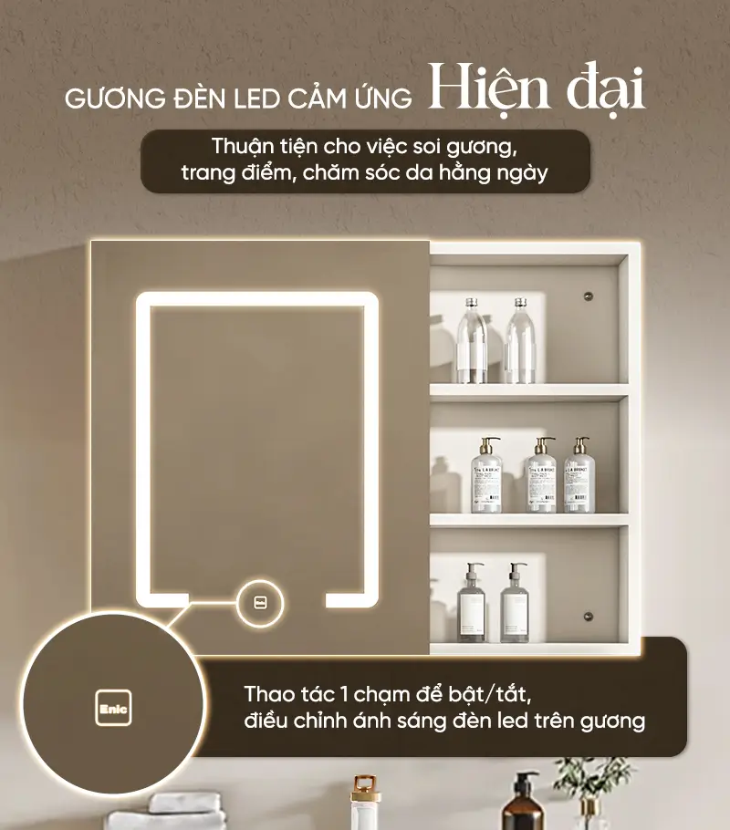 Đèn LED cảm ứng: Chỉ với một chạm nhẹ trên mặt gương, dải đèn LED sẽ tỏa sáng, hỗ trợ đắc lực cho việc trang điểm hoặc chăm sóc da với nguồn sáng trung thực.