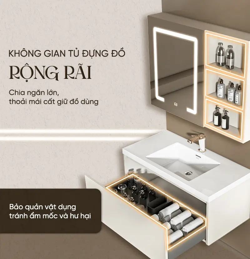 Tủ chứa đồ ẩn tiện lợi: Phía sau mặt gương là các ngăn kệ được phân chia khoa học, giúp bạn cất giữ mỹ phẩm, máy cạo râu hay bàn chải điện một cách ngăn nắp và khô ráo.