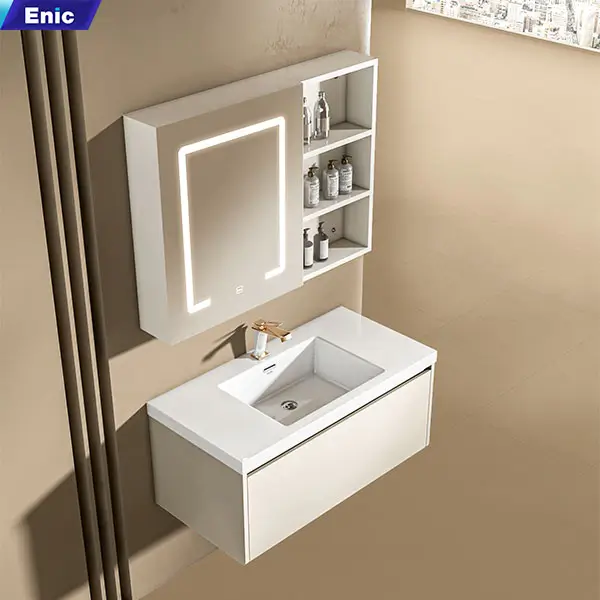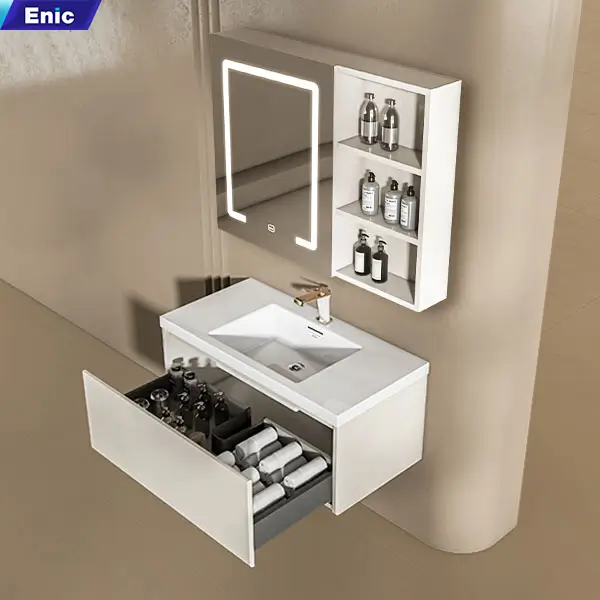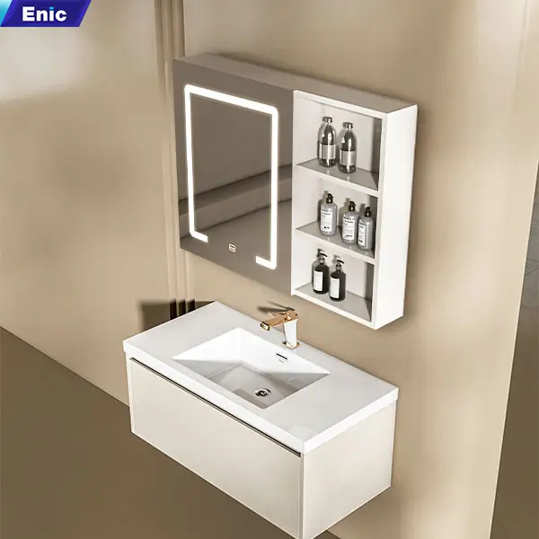 Enic uy tín đó giờ trên thị trường rồi nên mình yên tâm về chất lượng, nhận lắp xong đẹp, ưng hết ý. m phải lên đánh giá ngay, mặt đá sứ trắng, bóng sáng, gương đèn cảm ứng nhạy , sáng vừa phải khoongolafm chói mắt, tủ rộng rãi, tủ không đơn giản nên có dơ vệ sinh dễ
