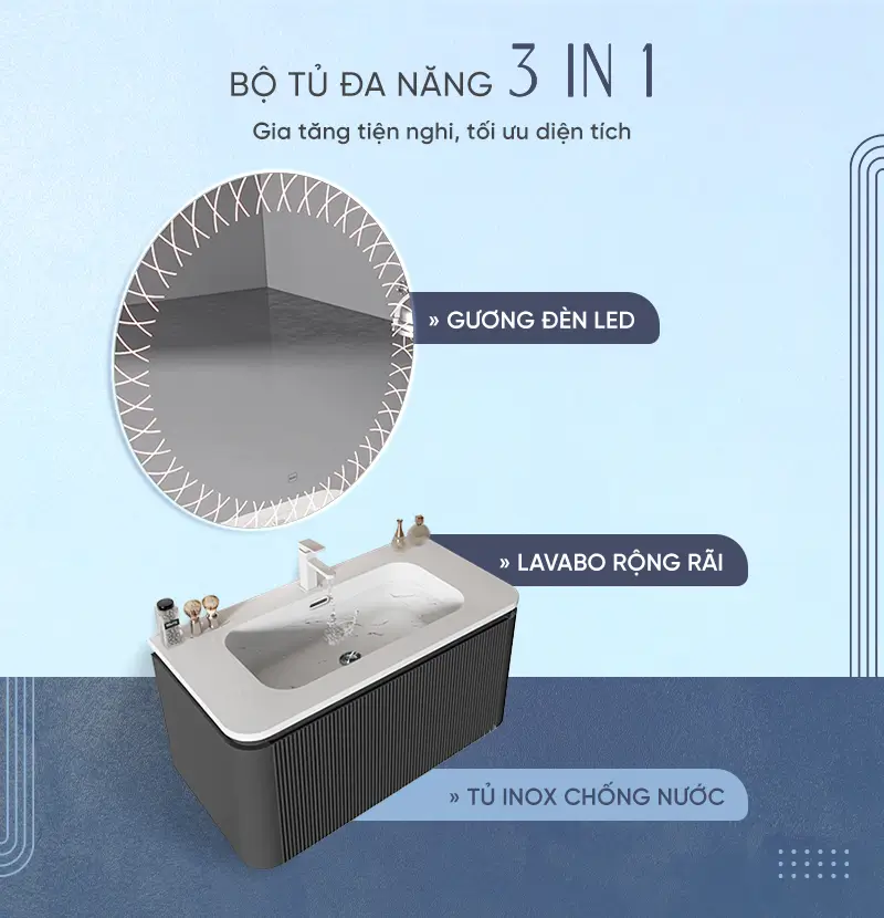 Tủ lavabo: Thiết kế cánh mở thông minh giúp tận dụng tối đa không gian phía sau gương để lưu trữ các loại mỹ phẩm, bàn chải điện, máy sấy tóc… giúp mặt bàn luôn gọn gàng, ngăn nắp.