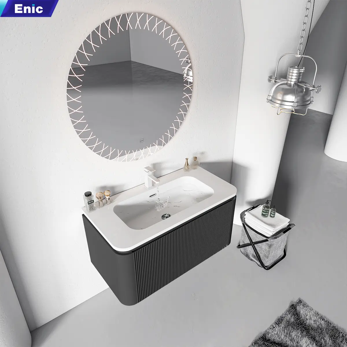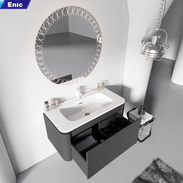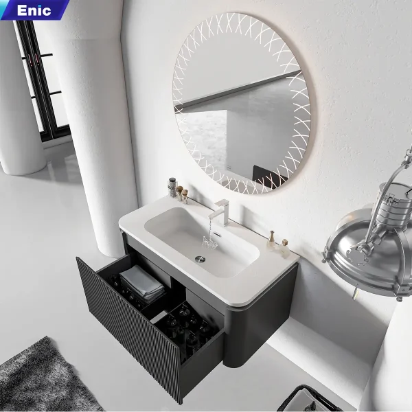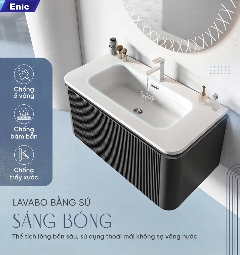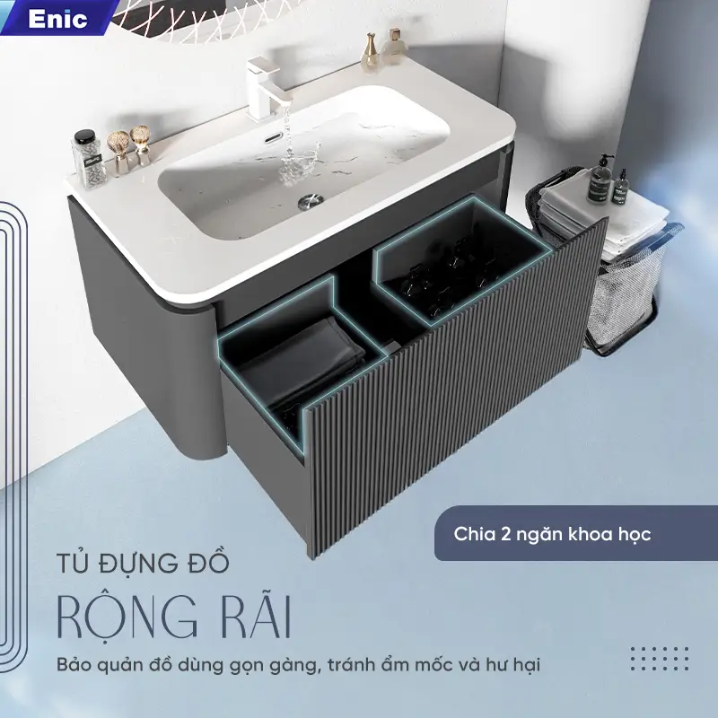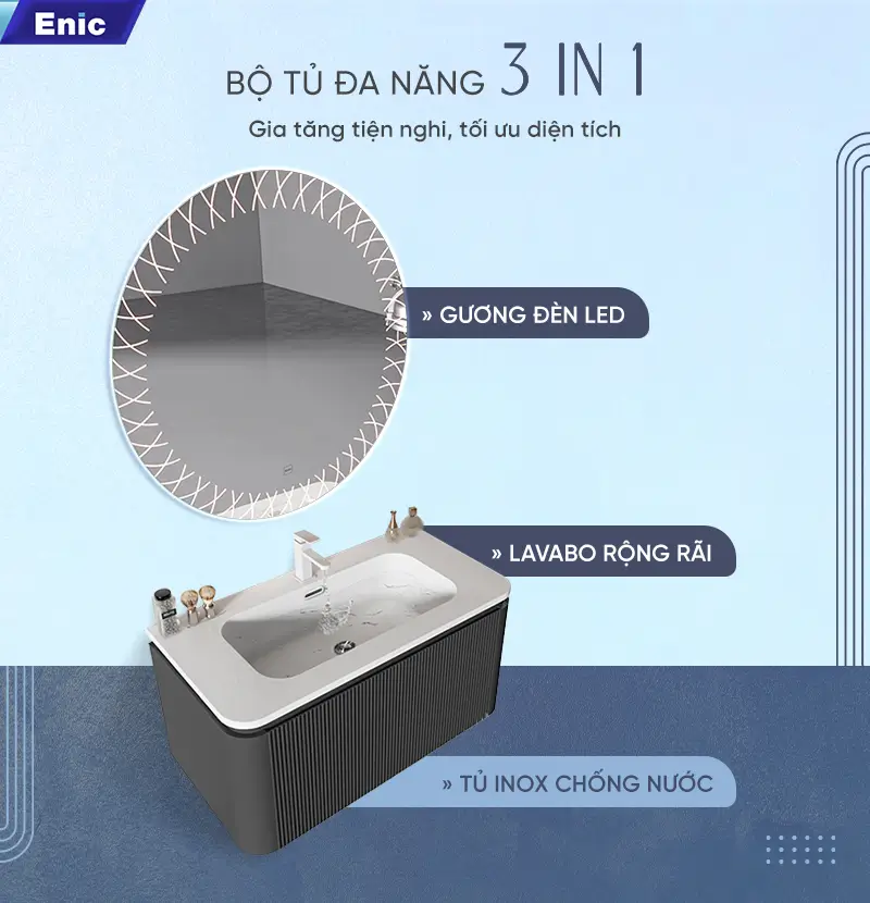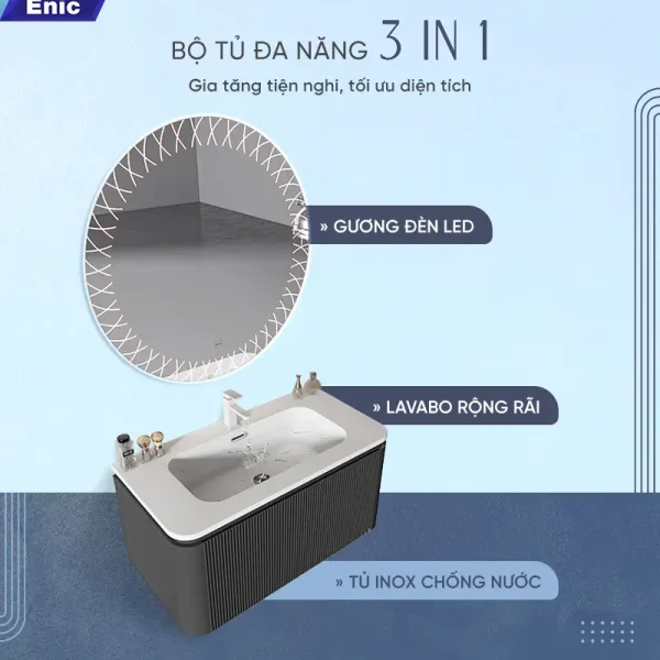 Trong phân khúc nội thất phòng tắm hạng sang, Bộ tủ gương Lavabo Enic Z20 là sự lựa chọn dành riêng cho những gia chủ yêu thích phong cách Modern Luxury. Sự kết hợp giữa tông màu xám trung tính, bề mặt vân đá tinh xảo và công nghệ gương LED thông minh tạo nên một tổng thể vừa mạnh mẽ, vừa thanh lịch, biến phòng tắm thành một không gian thư giãn thực thụ.