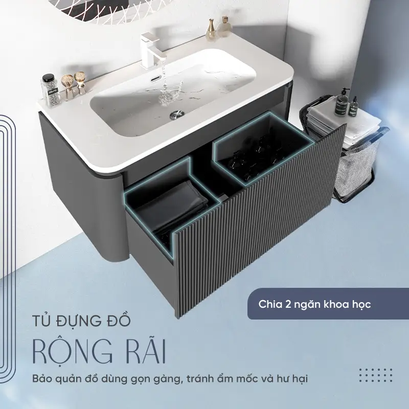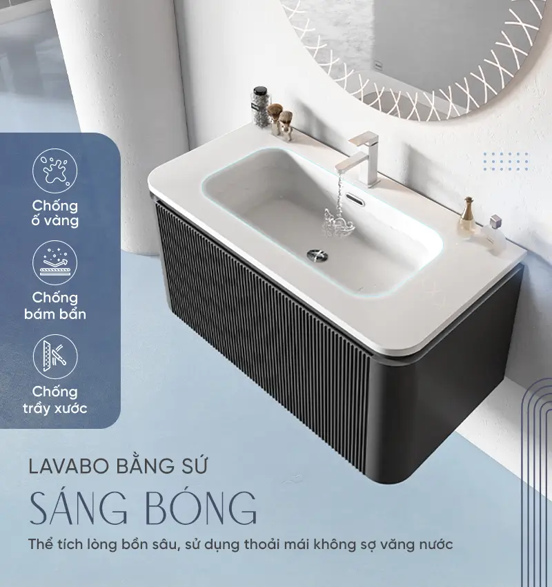 Lòng chậu sâu & Rộng: Thiết kế tối ưu giúp hạn chế tối đa tình trạng bắn nước ra ngoài, giữ cho bề mặt tủ và sàn nhà luôn khô ráo.