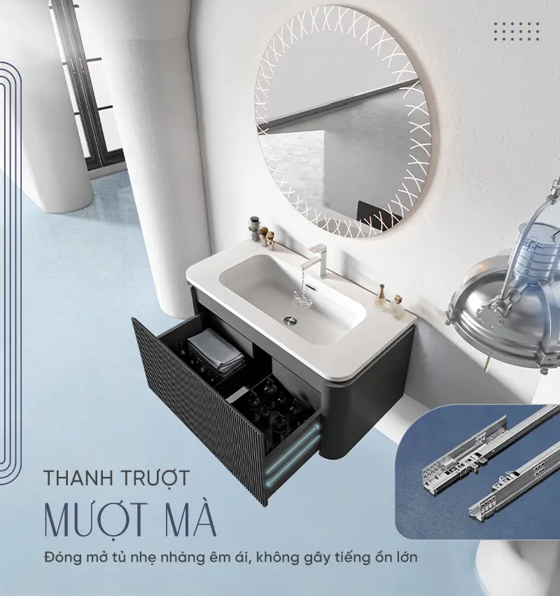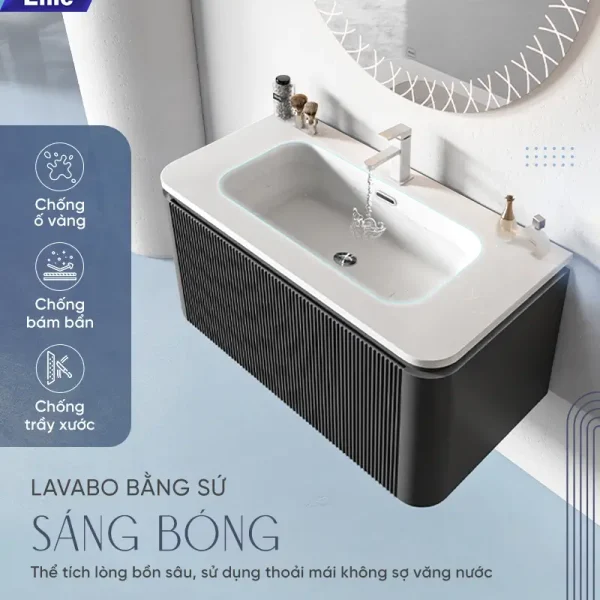 Bề mặt tủmàu sơn tỉ mỉ đều, mặt lavabo sứ kiểu nó bóng mịn, lòng lavabo sâu ít bị văng ướt đồ, vòi nước tia êm đều kiểu bọt không có mạnh né văng tùm lum như mấy kiểu khác. Gương có led ánh snags vừa phải đẹp hình phản chiếu đẹp không bị bóp méo