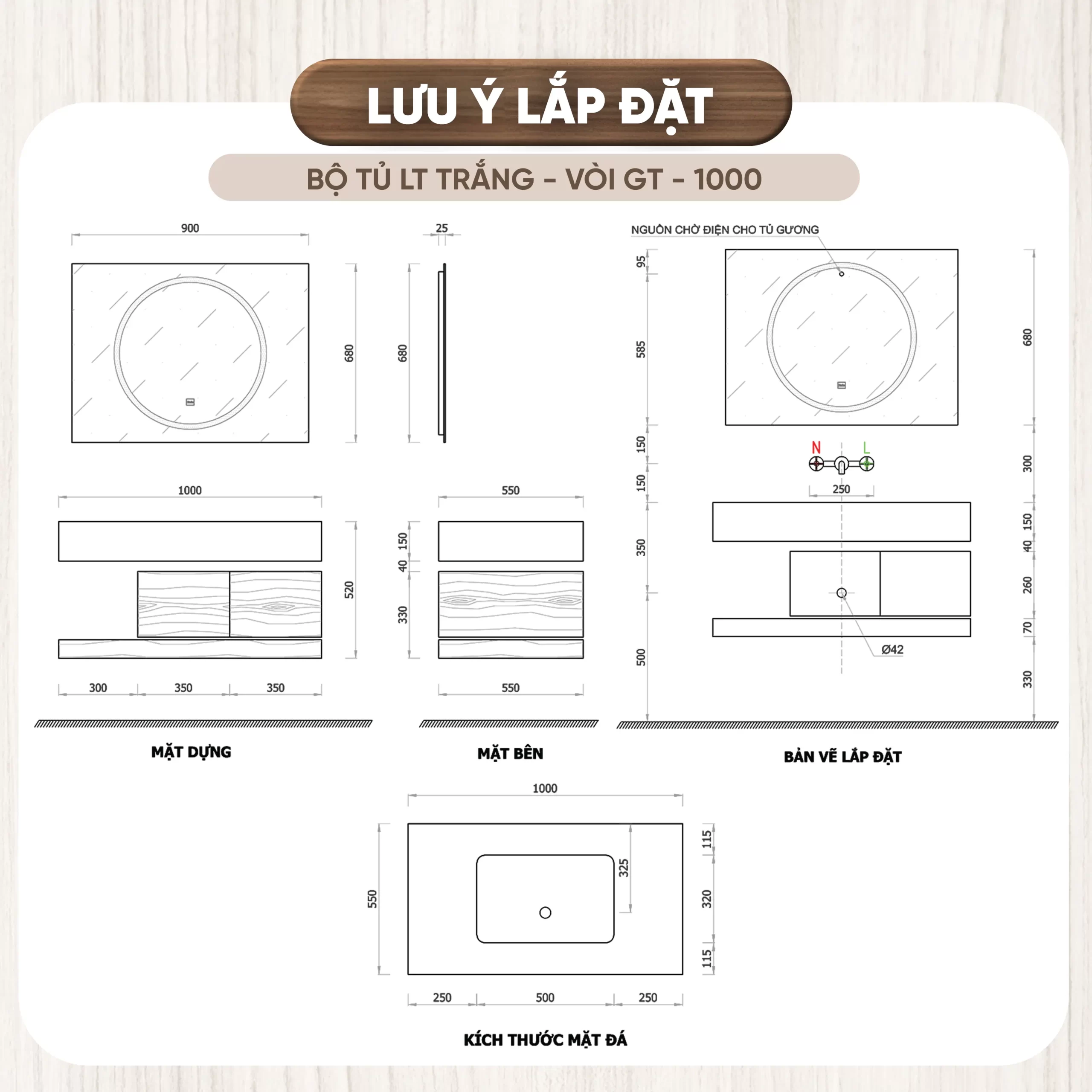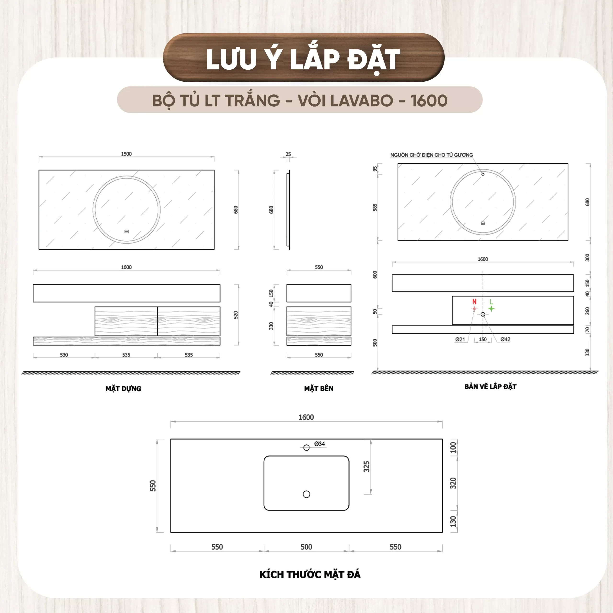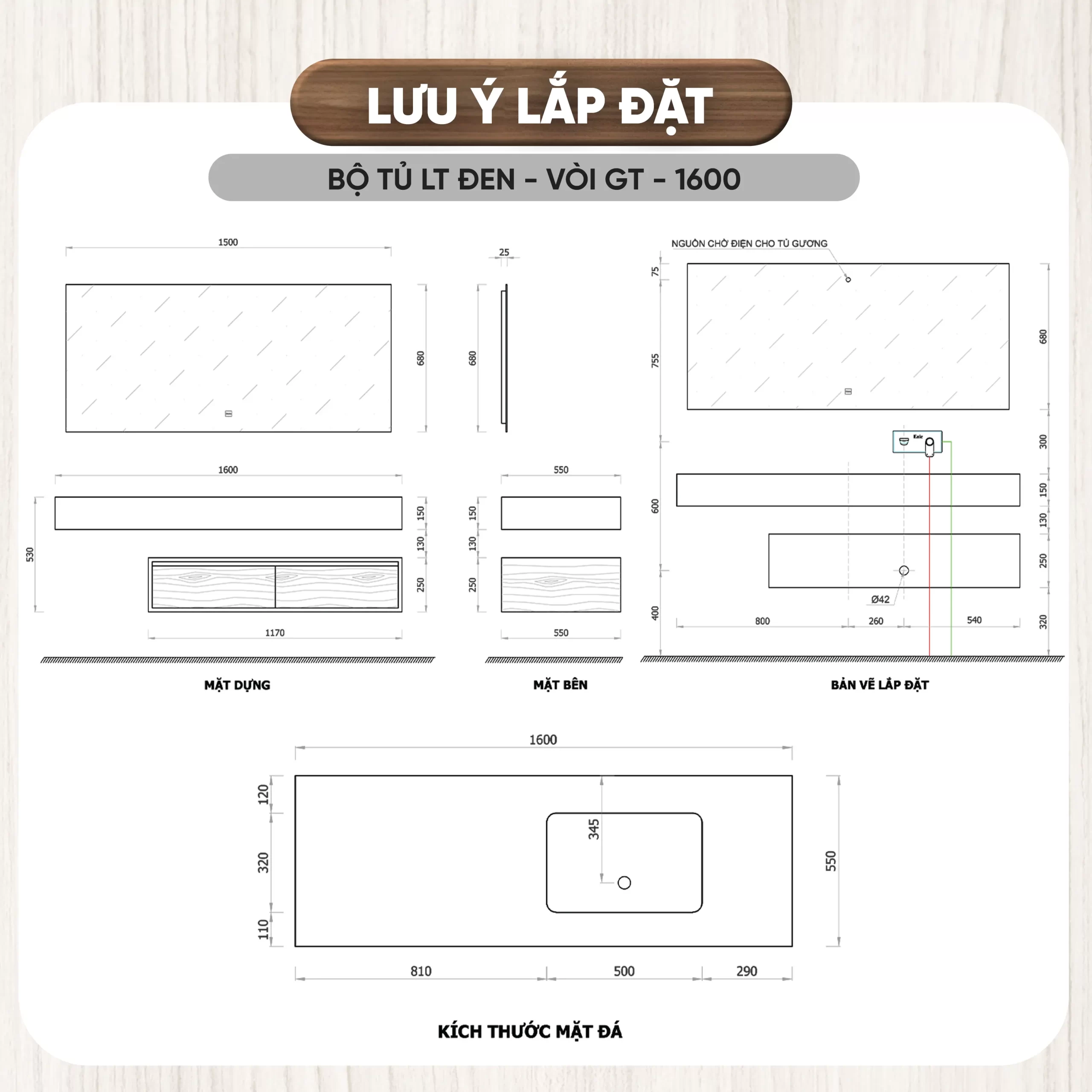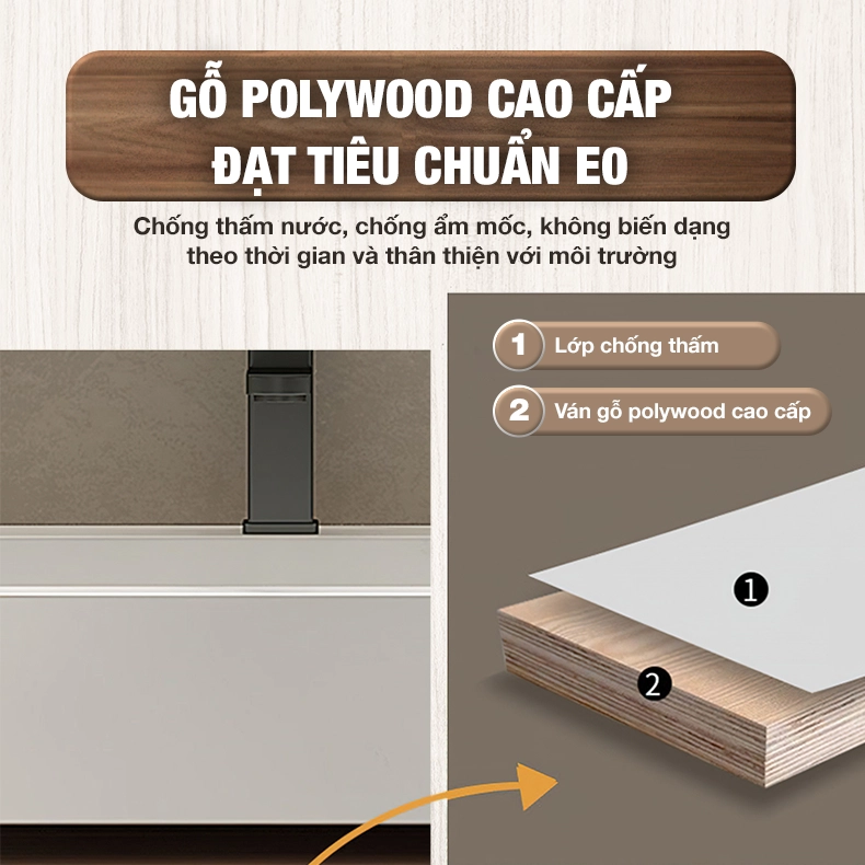 - Chất liệu tủ: Plywood cao cấp đạt tiêu chuẩn E1, giúp bảo vệ chống thấm nước, chống ẩm mốc, không bị biến dạng theo thời gian, thân thiện với môi trường.