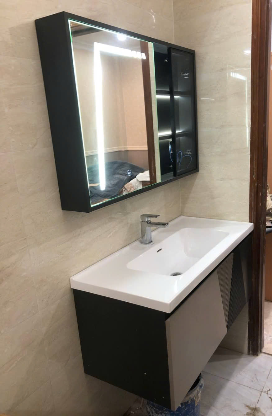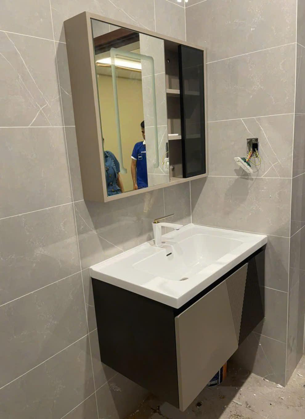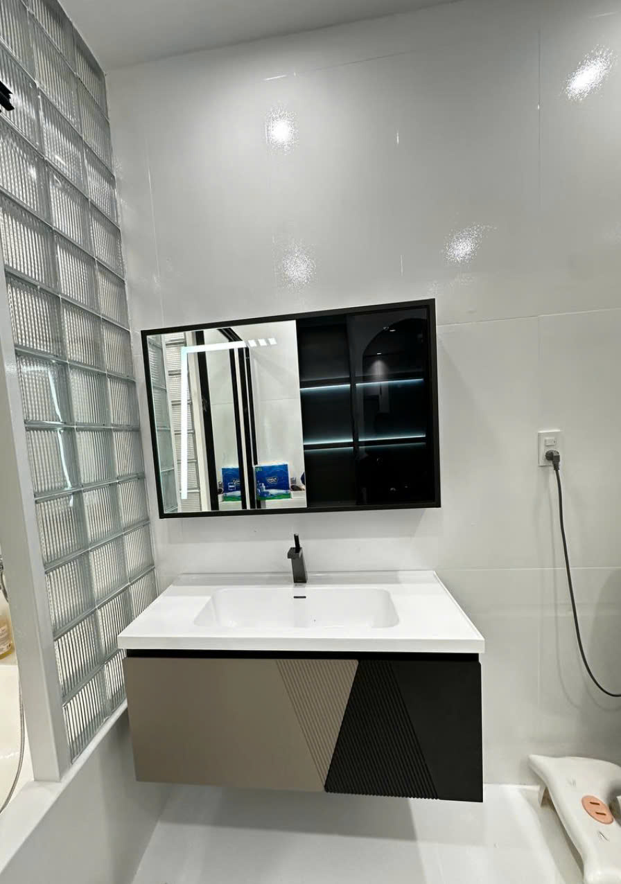 cả bộ tủ chứ gọn, gom hết đồ linh tinh vào tủ, nhà tắm gọn gàng, mặt đá lavabo cũng đẹp bóng, tủ gia công tỉ mỉ không thấy dăm gỗ