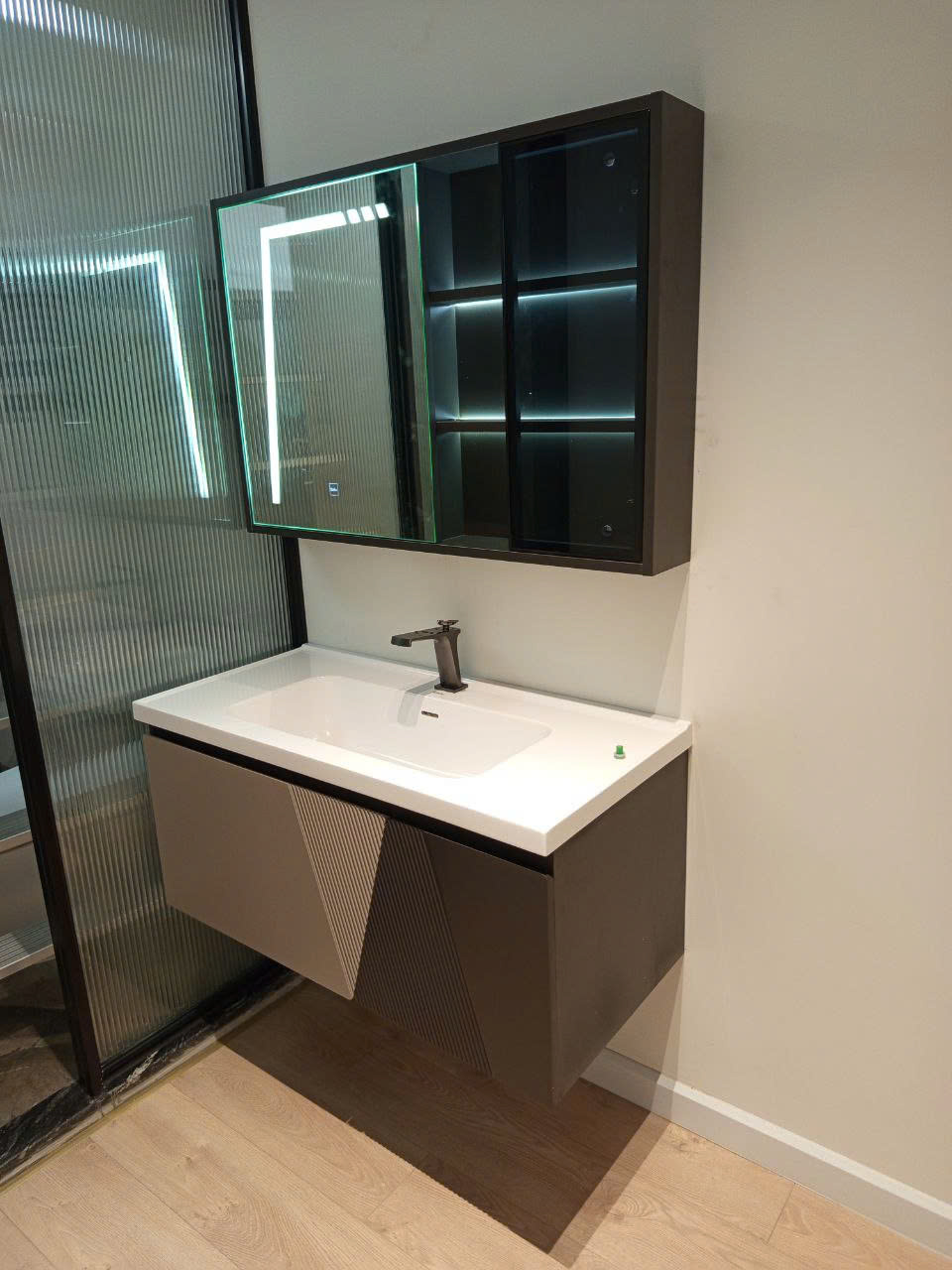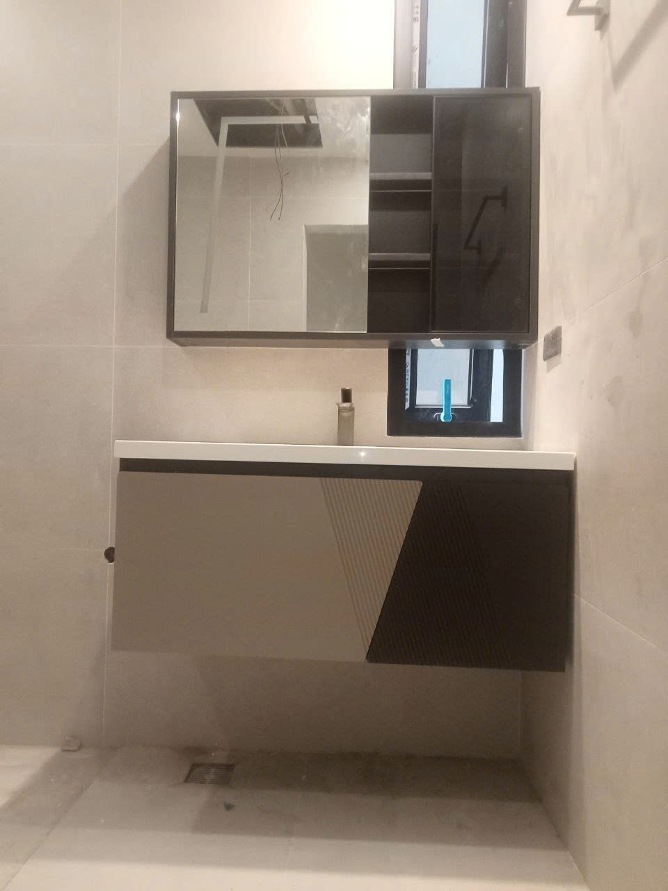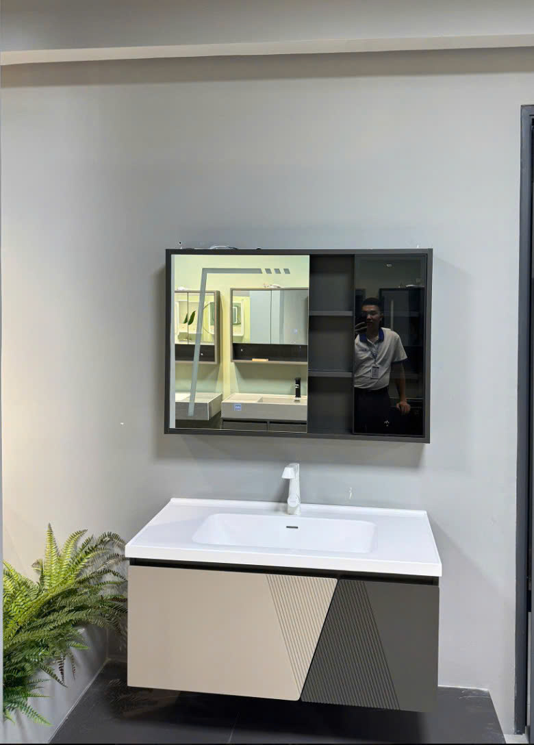 cả bộ tủ chứ gọn, gom hết đồ linh tinh vào tủ, nhà tắm gọn gàng, mặt đá lavabo cũng đẹp bóng, tủ gia công tỉ mỉ không thấy dăm gỗ