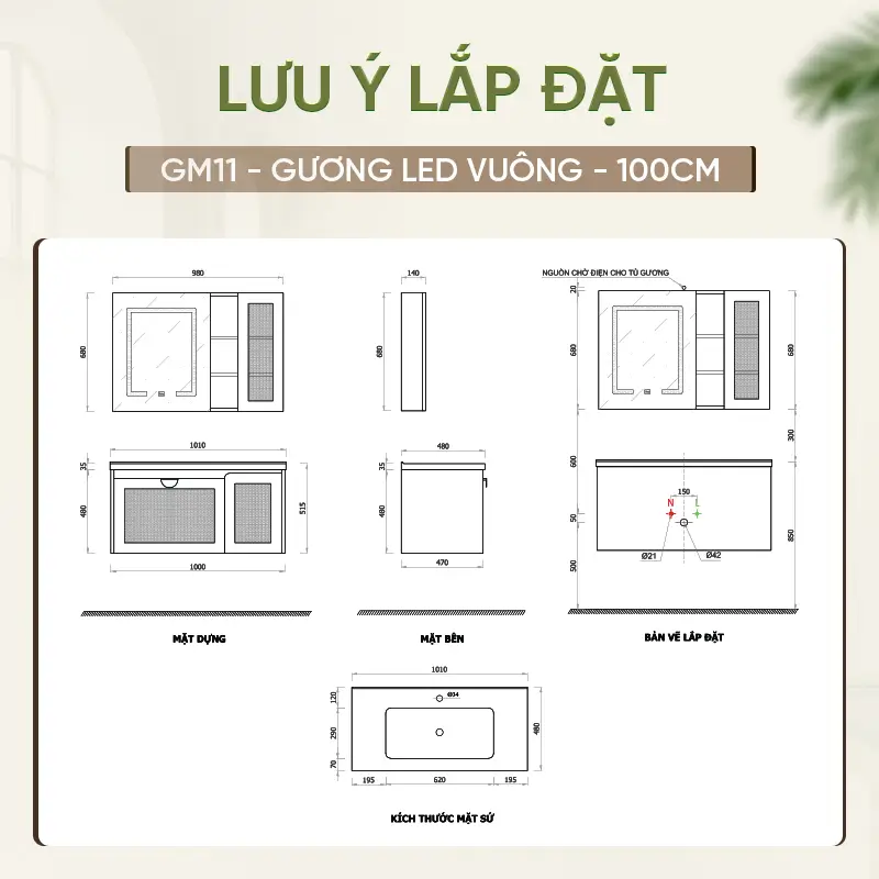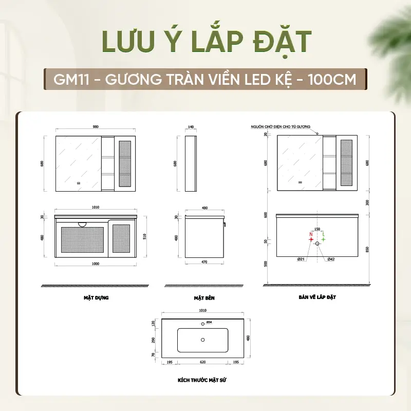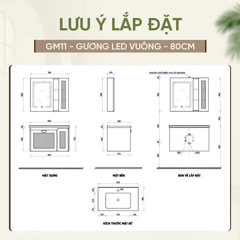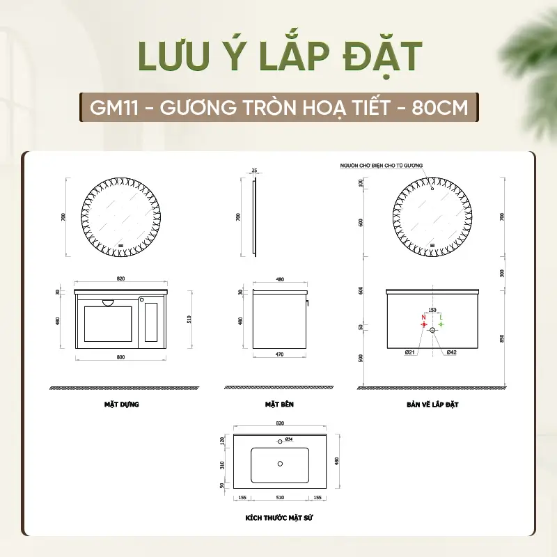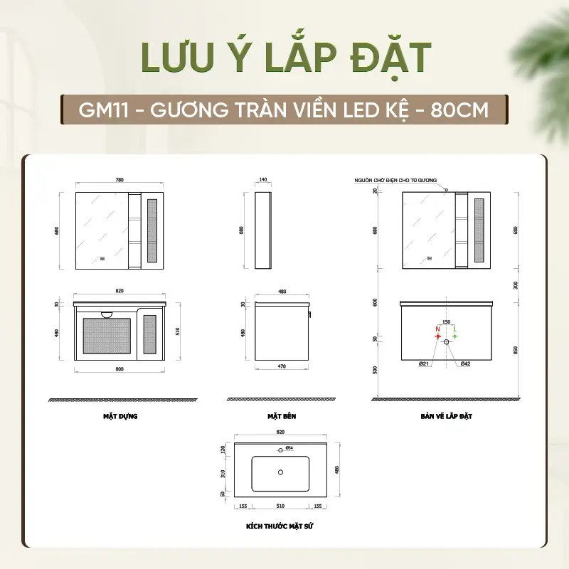 Thiết bị vệ sinh có hai kích thước tùy chọn là 80cm và 100cm, giúp bạn dễ dàng lựa chọn phù hợp với diện tích phòng tắm. Tủ lavabo Enic GM11 cho phép lựa chọn hai gam màu chủ đạo là màu gỗ và màu kem, mỗi màu đều mang một phong cách riêng: màu gỗ mộc mạc, sang trọng và màu kem tinh tế, thanh lịch. Ngoài ra, khách hàng có thể chọn giữa nhiều phiên bản gương như gương tròn họa tiết, gương tràn viền LED kệ hay gương LED vuông, đáp ứng sở thích và phong cách trang trí đa dạng.