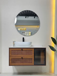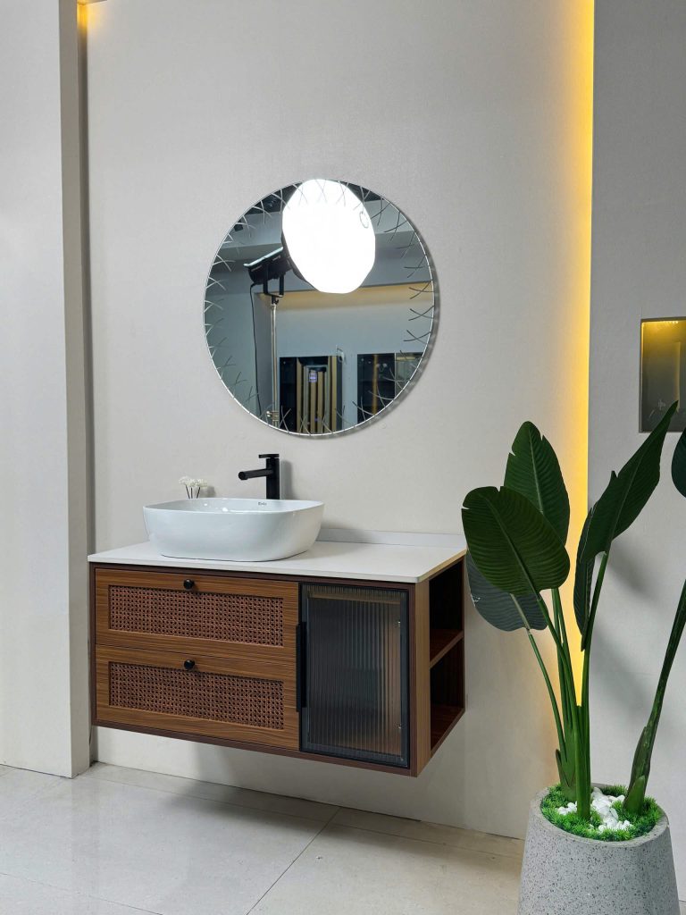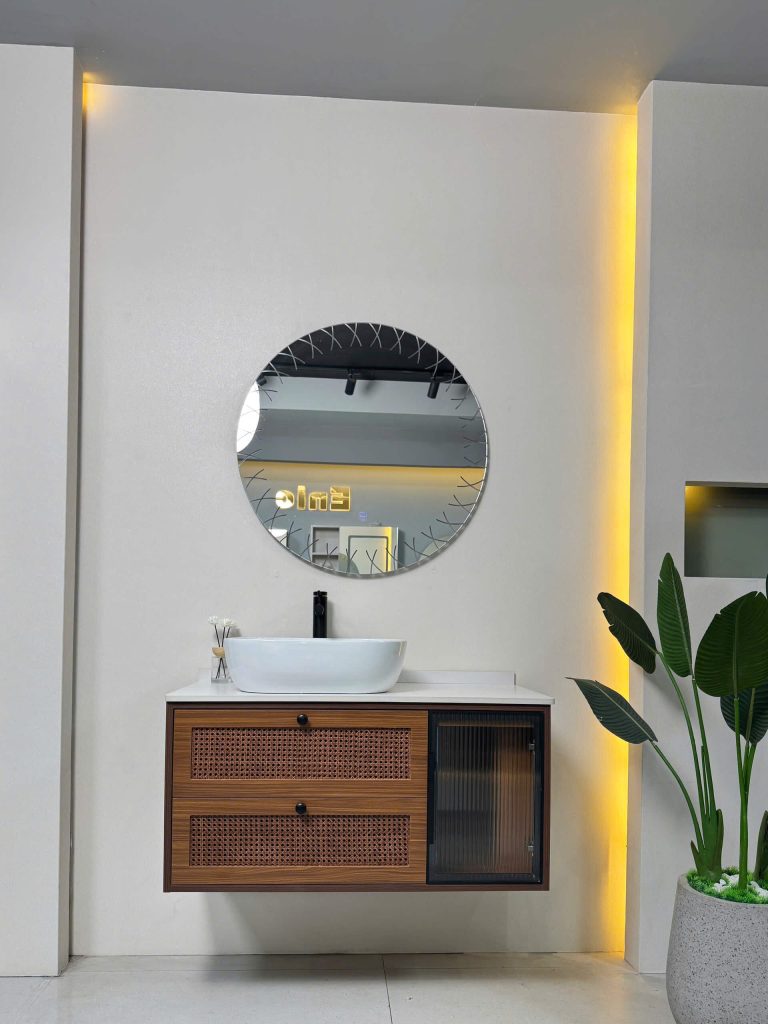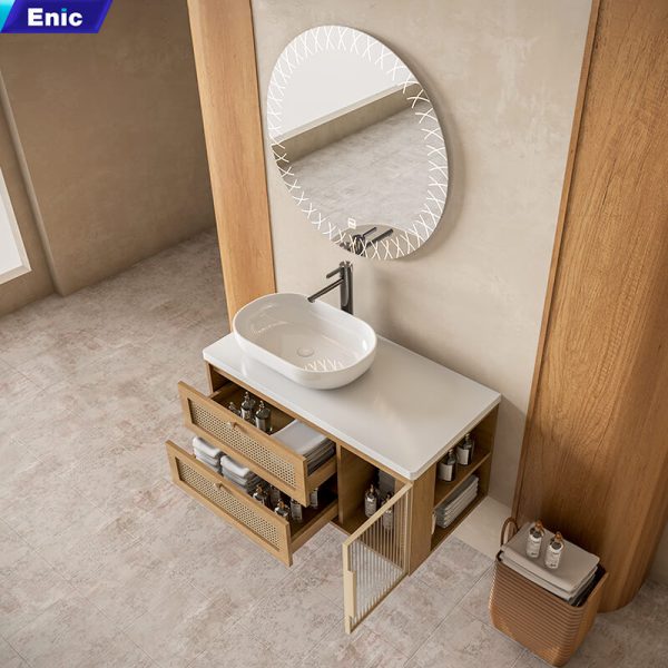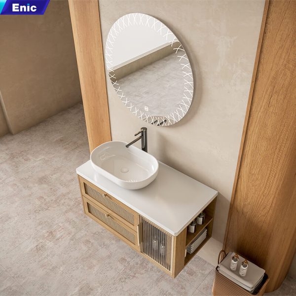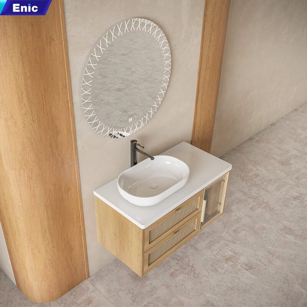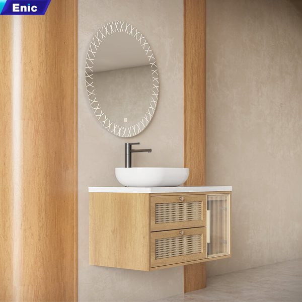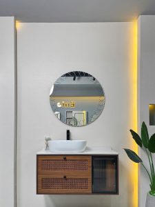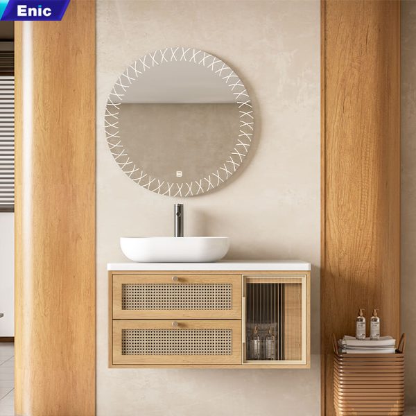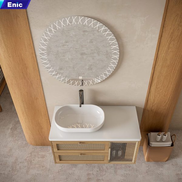 Gương đi kèm làm từ phôi Bỉ dày 5mm, chống nổ và oxy hóa, đảm bảo độ bền cao. Enic cung cấp nhiều phiên bản gương như gương tròn hoạ tiết, gương tràn viền led kệ hay gương led vuông tích hợp đèn LED một chạm, mang đến sự tiện nghi và vẻ đẹp độc đáo.