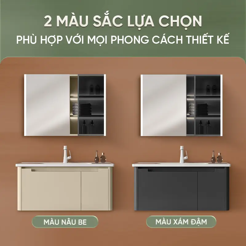 Lavabo đi kèm được chế tác từ gốm sứ chất lượng cao và phủ lớp men nano kháng khuẩn. Bề mặt sáng bóng này không chỉ dễ dàng làm sạch mà còn có khả năng kháng khuẩn hiệu quả, giữ cho không gian luôn sạch sẽ. Sản phẩm có hai tùy chọn màu sắc trang nhã là Màu Nâu ấm áp và Màu Xám hiện đại, cùng hai kích thước 80cm và 100cm để phù hợp với mọi diện tích phòng tắm.