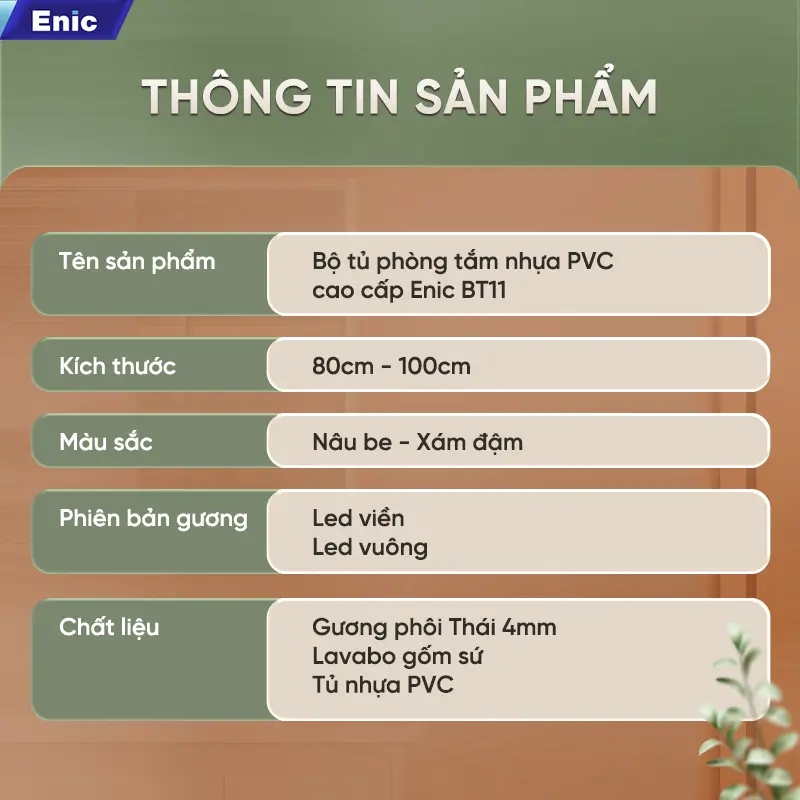 Với sự kết hợp hoàn hảo giữa độ bền của chất liệu PVC và sự tinh tế trong thiết kế, Enic BT11 là sự đầu tư xứng đáng, mang lại vẻ đẹp hiện đại và tiện nghi vượt trội cho phòng tắm của bạn.
