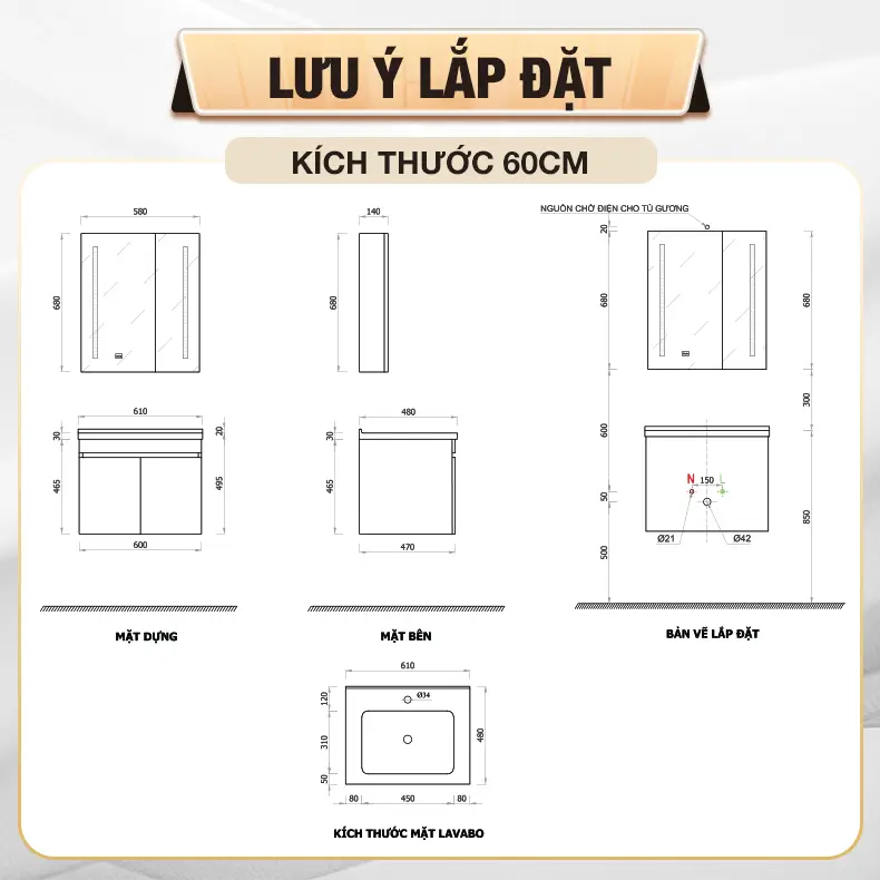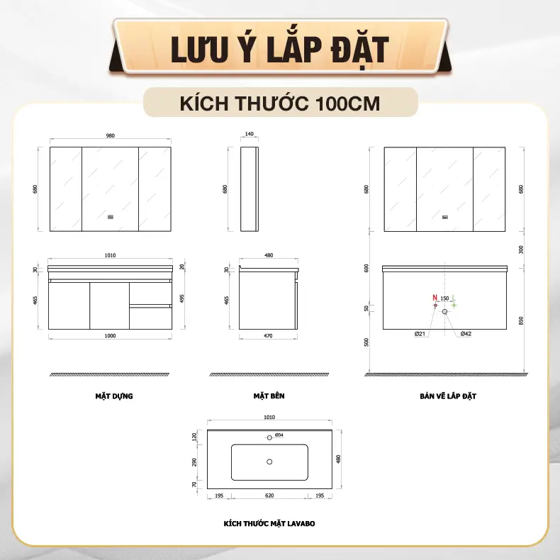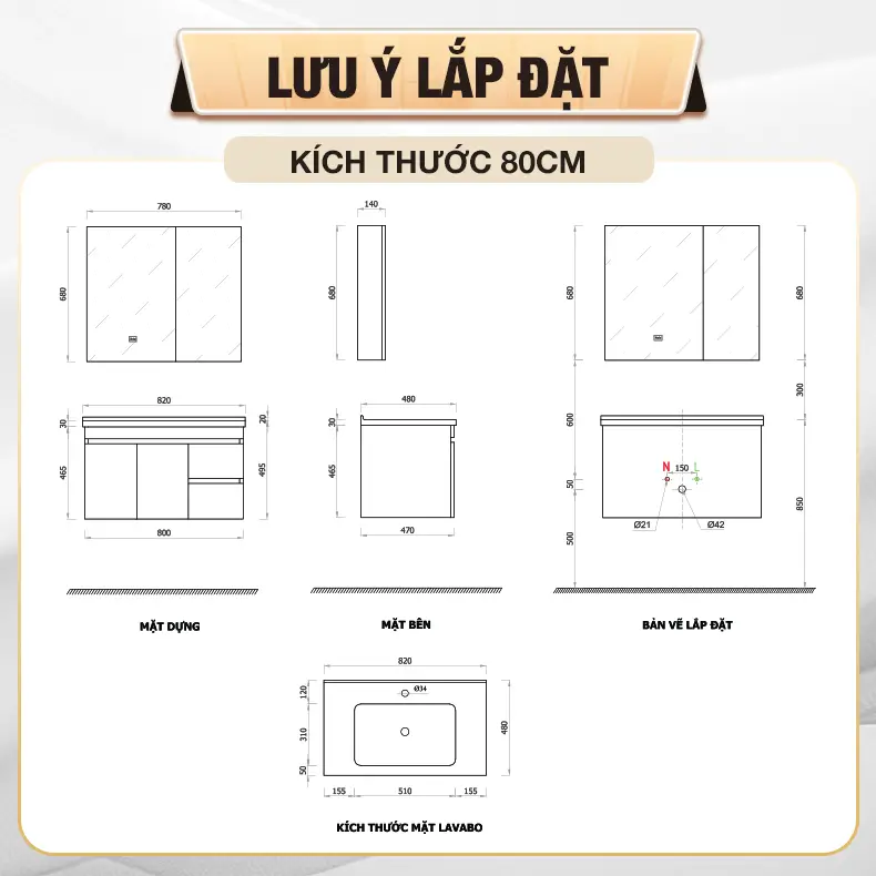- Chất liệu tủ lavabo: Ván gỗ Plywood đạt chuẩn E1 được phủ lớp Melamine cao cấp, chống thấm nước, chống ẩm.