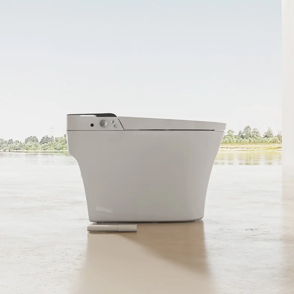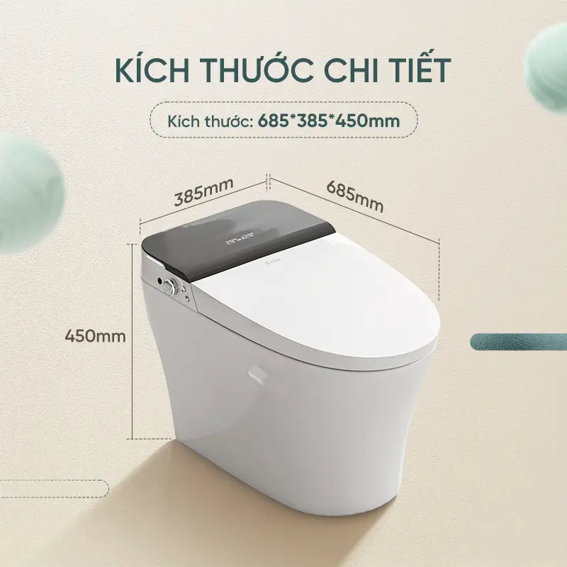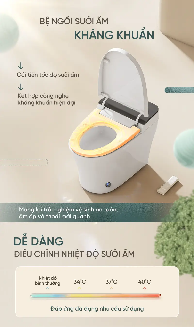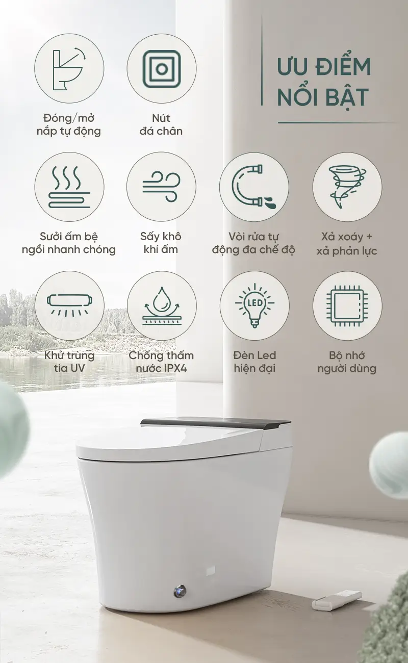Sản phẩm bồn cầu thông minh này có tính năng khử khuẩn bằng tia UV giúp loại bỏ vi khuẩn, duy trì môi trường vệ sinh sạch sẽ. Đặc biệt, bồn cầu đạt tiêu chuẩn chống nước IPX4, đảm bảo độ bền và an toàn trong môi trường ẩm ướt.