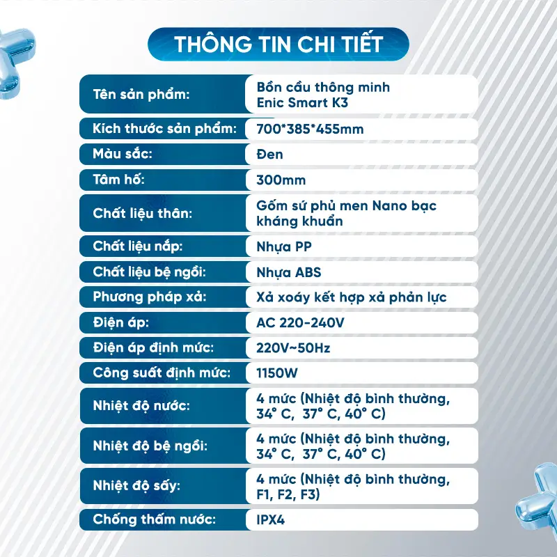 Công nghệ xả xoáy kết hợp xả phản lực không chỉ mạnh mẽ mà còn tiết kiệm nước hiệu quả. Bồn cầu cho phép bạn điều chỉnh áp lực nước, vị trí vòi rửa theo ý muốn, cùng tính năng sấy khô bằng khí ấm, mang đến cảm giác thoải mái tối đa. Ngoài ra, bồn cầu thông minh Enic Smart K3 còn tích hợp màn hình LED hiển thị thông số nhiệt độ, đèn LED ban đêm tiện dụng và khả năng xả nước ngay cả khi mất điện. Đặc biệt, với tiêu chuẩn chống nước IPX4, bạn hoàn toàn yên tâm về độ bền và an toàn trong quá trình sử dụng.