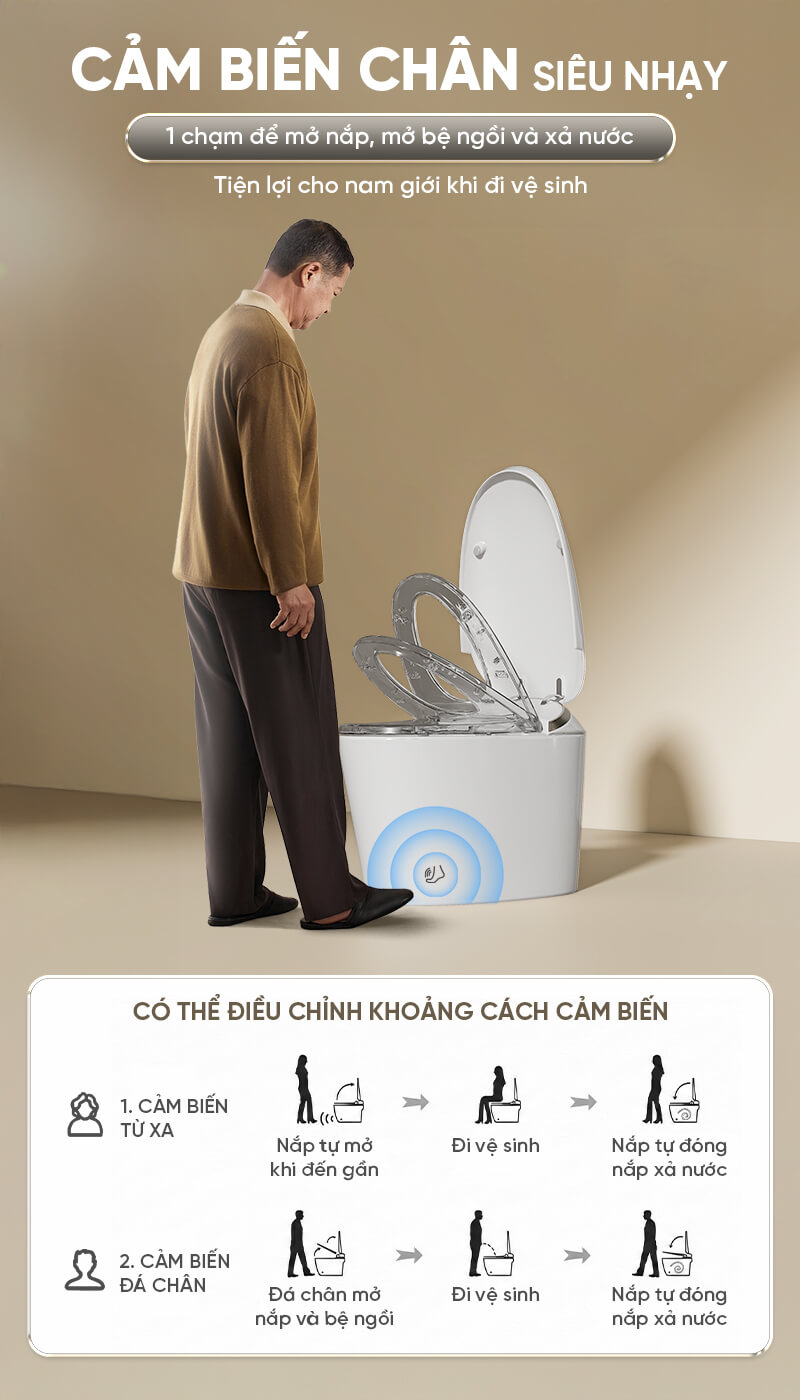 Cảm biến đá chân: Một cú chạm nhẹ bằng chân ở phía dưới bồn cầu sẽ kích hoạt chế độ lật bệ ngồi hoặc xả nước, cực kỳ tiện lợi cho nam giới.