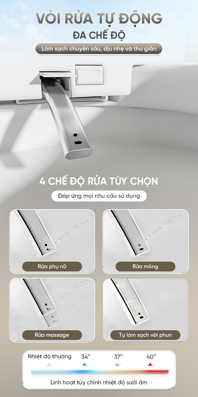 Không chỉ là một chiếc bồn cầu thông thường, Smart S08 sở hữu hệ thống vòi xịt đa năng với khả năng tự làm sạch vòi trước và sau khi sử dụng: