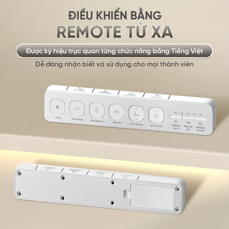 Tùy chỉnh linh hoạt: Bạn có thể điều chỉnh áp lực nước, vị trí vòi rửa và nhiệt độ (4 mức từ nhiệt độ thường đến 40°C) thông qua Remote điều khiển từ xa hoặc nút xoay bên hông.