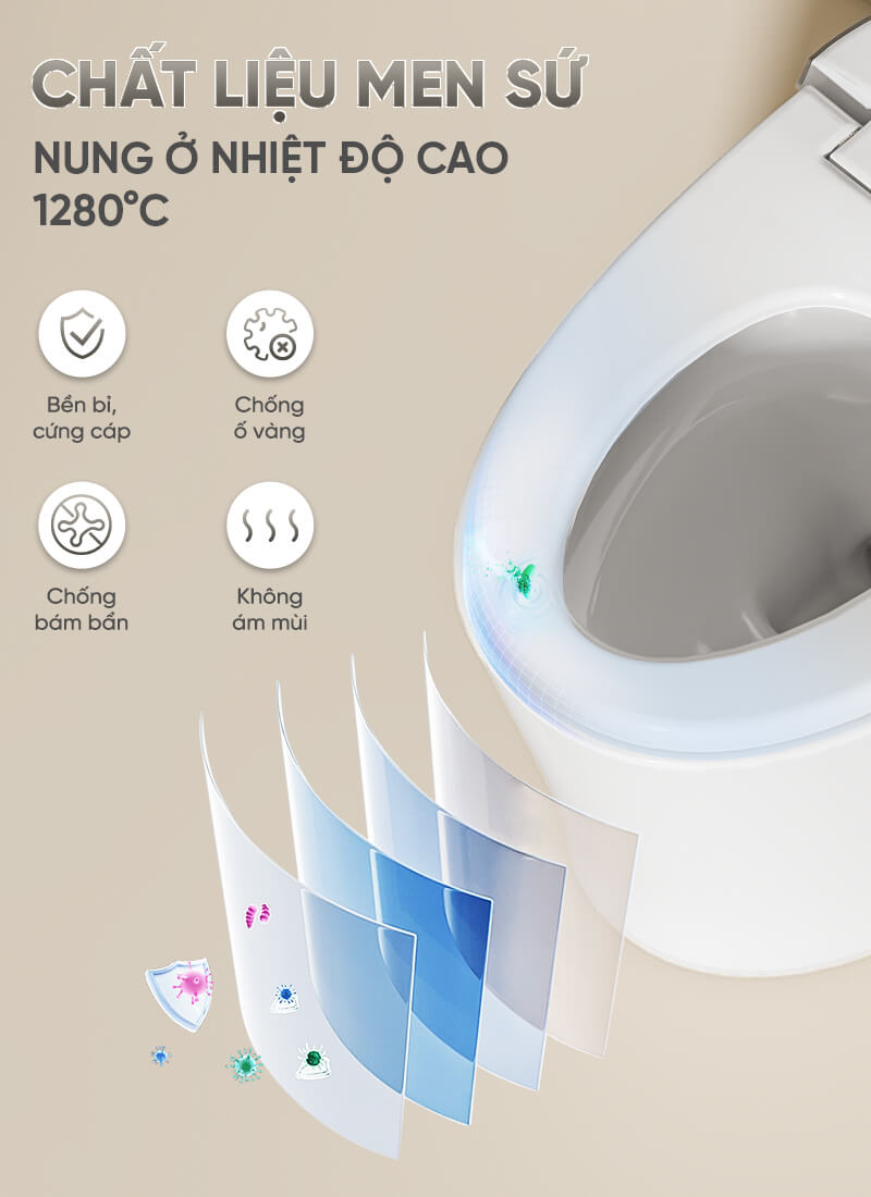 Chất liệu: Thân gốm sứ cao cấp tráng men chống bám bẩn, nắp nhựa PP bền bỉ, tải trọng chịu lực lên đến 300kg.