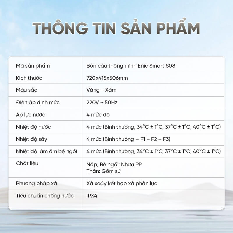Nâng tầm chất lượng sống và biến không gian thư giãn của bạn thành một “spa thu nhỏ” với Bồn cầu thông minh Enic Smart S08. Đây là mẫu thiết bị vệ sinh cao cấp nhất hiện nay, hội tụ đầy đủ những công nghệ tiên tiến để mang lại sự tiện nghi, sạch sẽ và sang trọng tuyệt đối cho ngôi nhà của bạn.