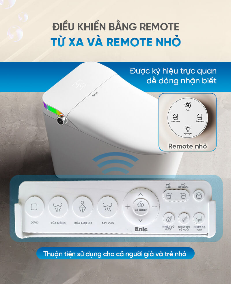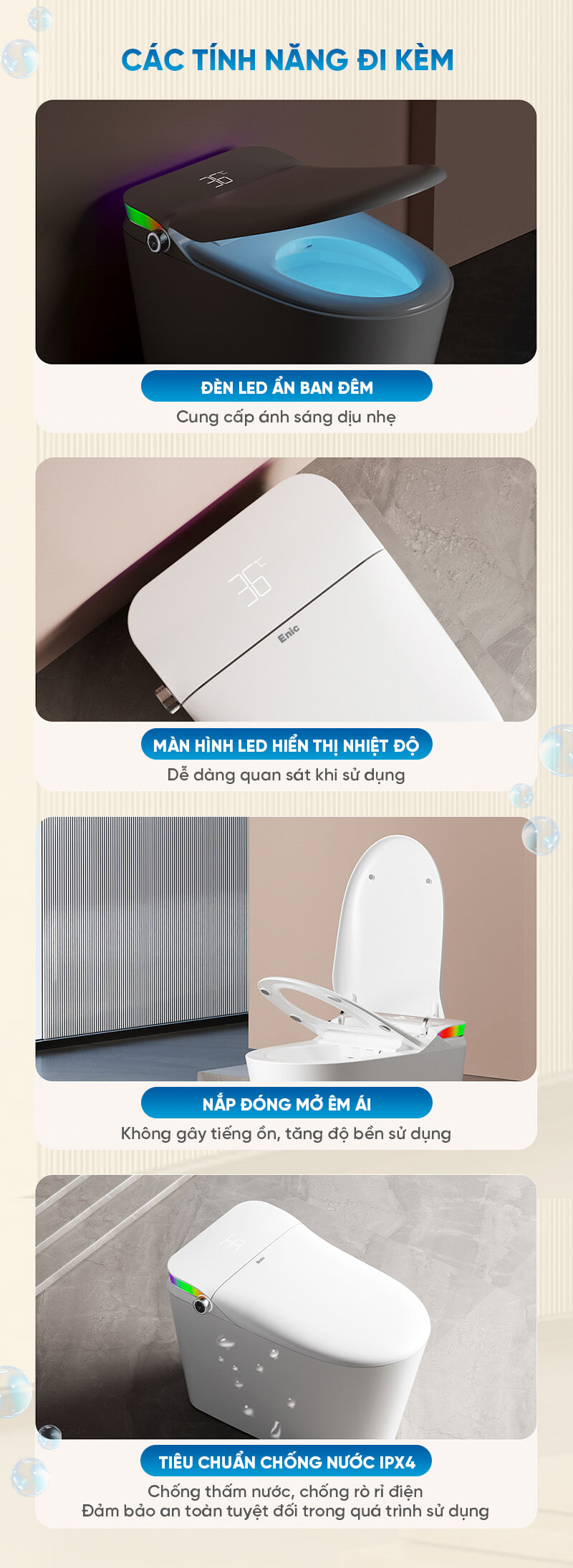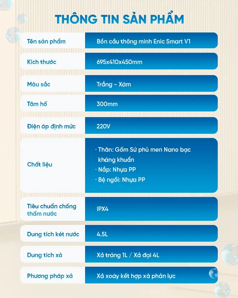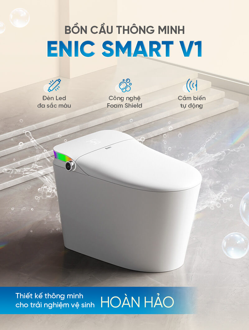 Ngoài ra, Enic Smart V1 còn tích hợp tia UV khử khuẩn bồn cầu, pin dự phòng tự động sạc, nắp đóng giảm chấn và chất liệu gốm sứ nung phủ Nano bạc kháng khuẩn, đảm bảo an toàn và vệ sinh sạch sẽ.