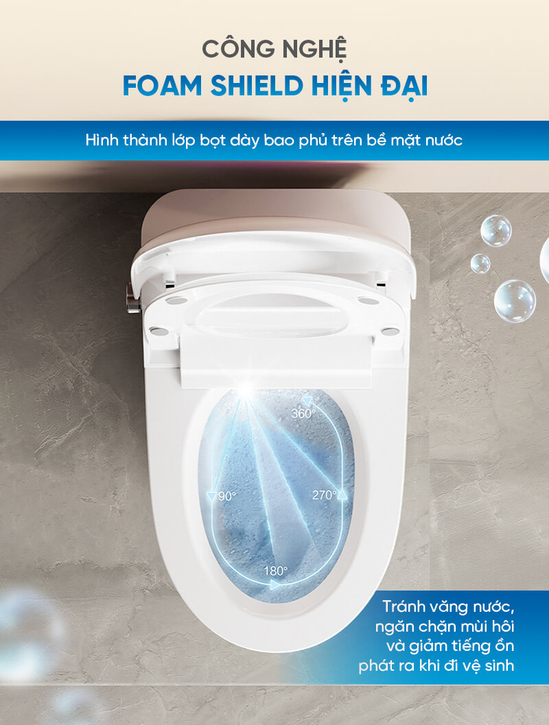Bồn cầu thông minh Enic Smart V1 mang lại trải nghiệm vệ sinh hoàn toàn mới nhờ tích hợp công nghệ tiên tiến. Điểm nhấn đặc biệt của sản phẩm chính là công nghệ Foam Shield đột phá. Lớp bọt đặc biệt được hình thành trên bề mặt nước không chỉ ngăn chặn nước bắn tung tóe, khử mùi hôi hiệu quả mà còn giảm thiểu tiếng ồn khi sử dụng.