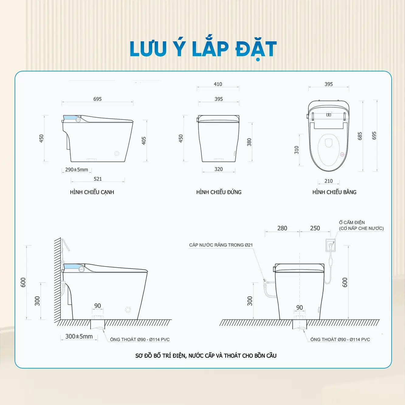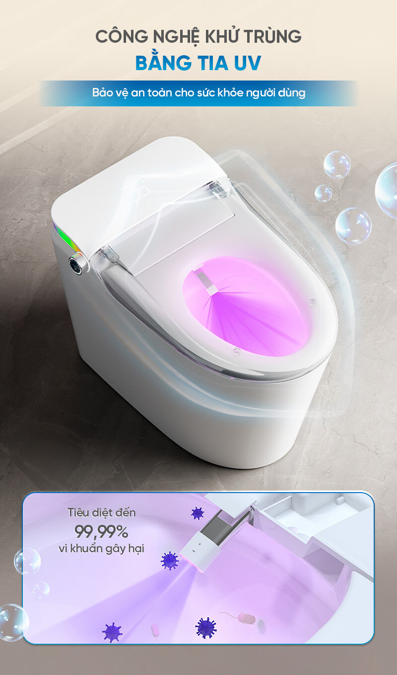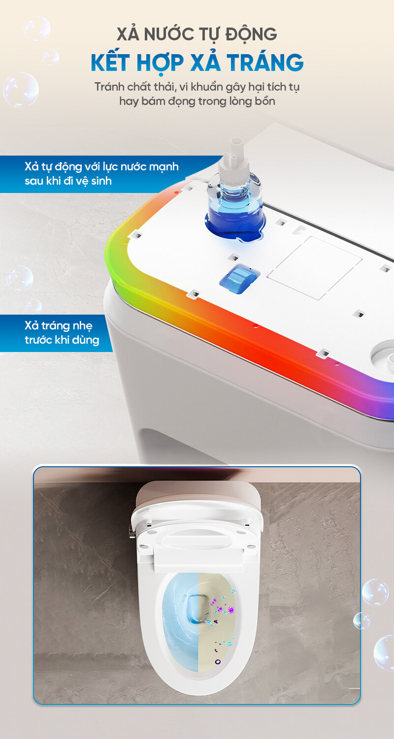Bồn cầu thông minh V1 sở hữu thiết kế hiện đại với kích thước 680*400*465mm. Tích hợp hàng loạt tính năng thông minh như tự động lật nắp, cảm biến đá chân tự động xả nước, remote điều khiển từ xa và nút xoay điều khiển bên hông tiện lợi. Vòi xịt đa chế độ cung cấp các lựa chọn rửa sau, rửa phụ nữ, rửa di động và tự làm sạch vòi, đảm bảo vệ sinh tối ưu. Phương pháp xả xoáy kết hợp xả phản lực mạnh mẽ cuốn trôi mọi vết bẩn.