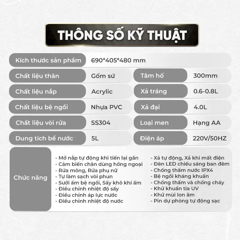 Thiết kế đẹp, hiện đại, tự động mở đóng nhạy, nhanh, bệ ngồi êm, ấm, xịt sạch, hông khô dễ chịu