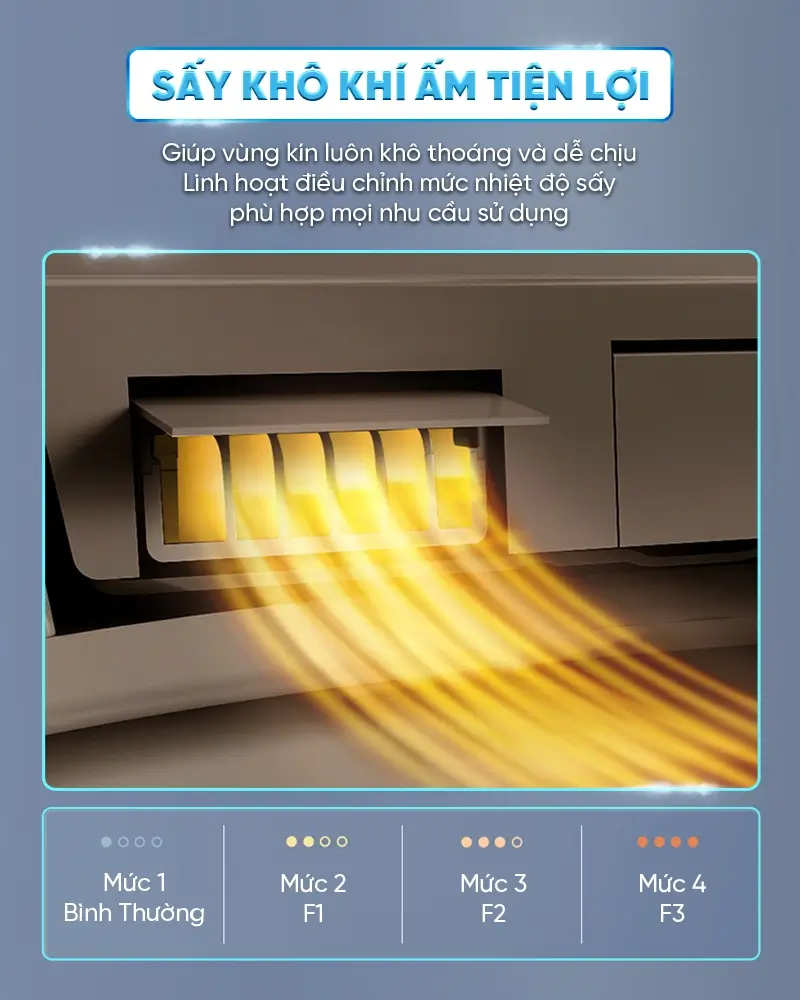 bồn treo nhỏ gọn, cứng chắc, bệ ngồi luôn ấm, khô ráo, sạch sẽ, đi vệ sinh có chế độ sấy khô, khí nhẹ ấm, khô nhanh dễ chịu.