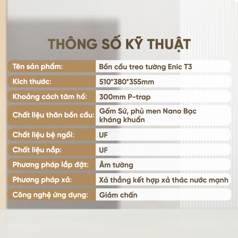 Bồn cầu treo tường Enic T3 có những đặc điểm sau: