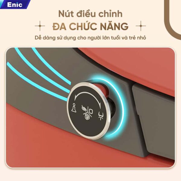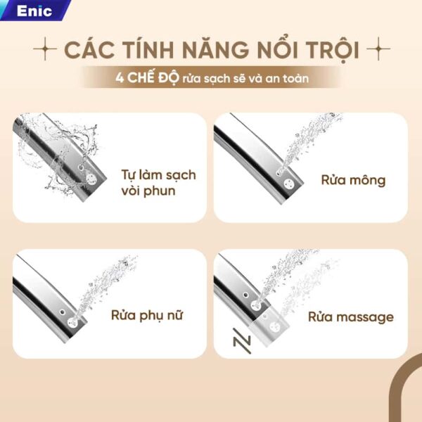 Bồn cầu thông minh Enic B4 có bệ ngồi ion bạc kháng khuẩn, gây ức chế sự phát triển của vi khuẩn đem lại sự an tâm về các bệnh viêm nhiễm cho người dùng. Vòi rửa đa chế độ phù hợp với đa chế độ sử dụng, rửa mông, rửa phụ nữ, massage nóng – lạnh, điều chỉnh áp lực nước, tự làm sạch vòi rửa. Tích hợp nút điều khiển đa chức năng. Nhấn 1 lần để sấy khô, nhấn thêm lần nữa để tắt sấy khô. Vặn sang phải để rửa mông, vặn sang trái để rửa phụ nữ. Công nghệ điện phân nước trực tiếp giúp khử trùng, diệt khuẩn lên đến 99,9%.