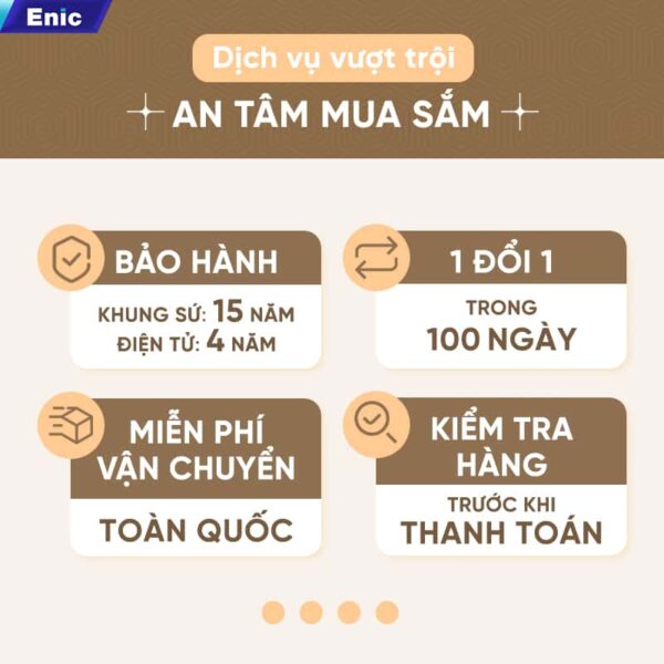 Mua sản phẩm Enic để được miễn phí vận chuyển toàn quốc, 1 đổi 1 trong vòng 100 ngày. Bảo hành điện tử bảo hành 4 năm và khung sứ lên tới 15 năm.