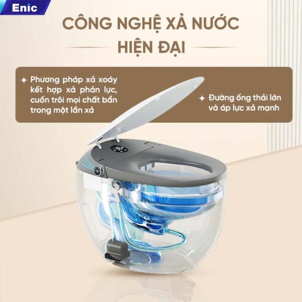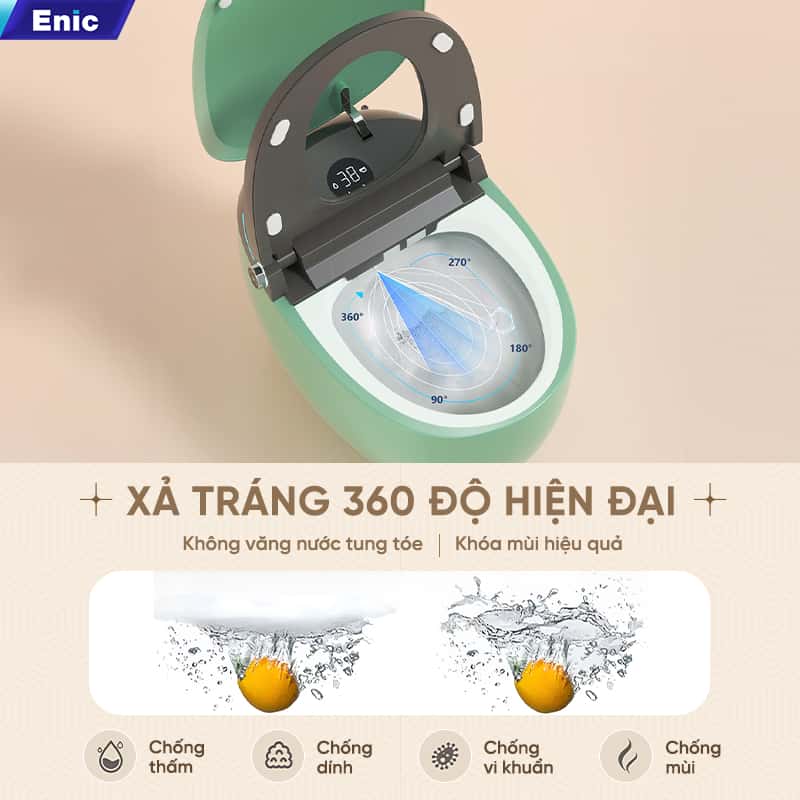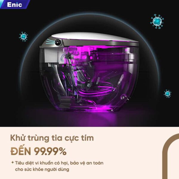 Két nước bồn cầu kết hợp bơm tăng áp siêu mạnh, lực đẩy trọng lực và khí động học giúp bồn cầu sử dụng bình thường trong môi trường có áp suất nước thấp. Đặc biệt, bồn cầu trứng thông minh Enic Smart B4 được trang bị đèn diệt khuẩn tia cực tím UV khử trùng hiệu quả. Trong vòng 15 giây loại bỏ mùi hôi khó chịu sau khi đi vệ sinh giúp không khí trong lành.