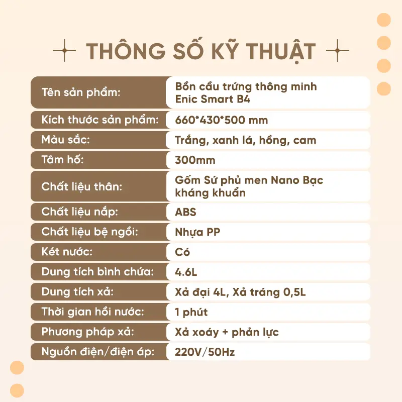 Két nước bồn cầu kết hợp bơm tăng áp siêu mạnh, lực đẩy trọng lực và khí động học giúp bồn cầu sử dụng bình thường trong môi trường có áp suất nước thấp. Đặc biệt, bồn cầu trứng thông minh Enic Smart B4 được trang bị đèn diệt khuẩn tia cực tím UV khử trùng hiệu quả. Trong vòng 15 giây loại bỏ mùi hôi khó chịu sau khi đi vệ sinh giúp không khí trong lành.