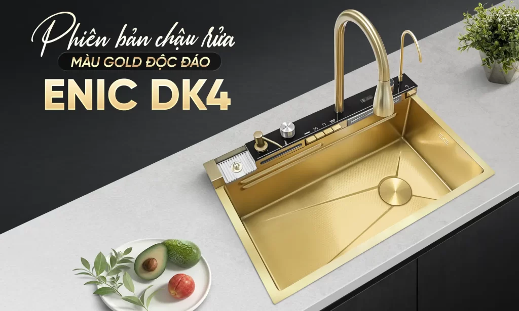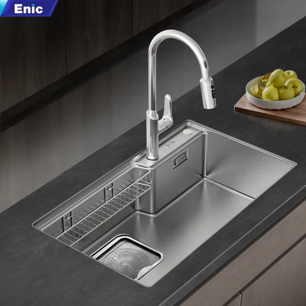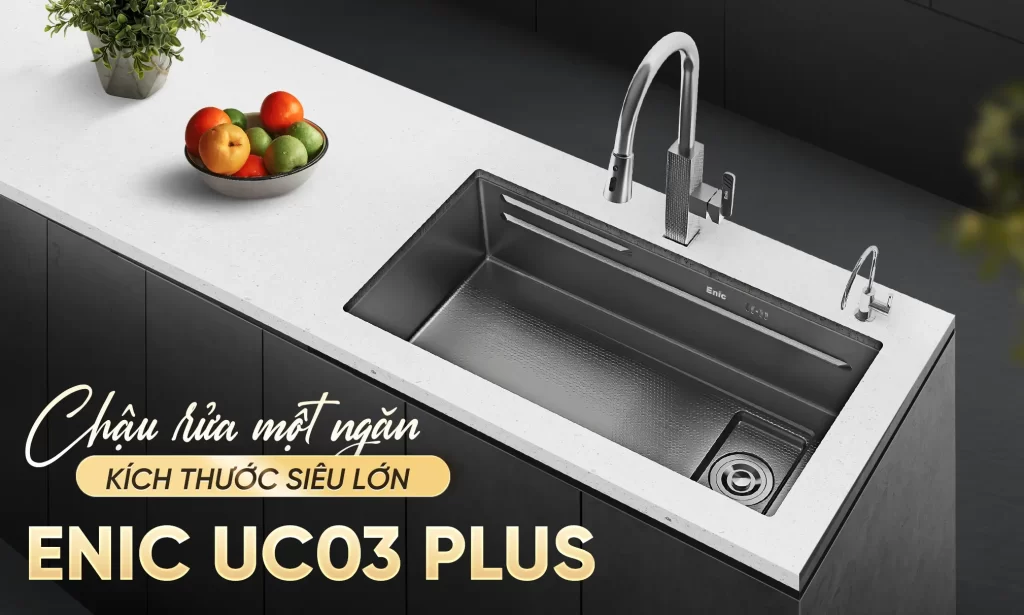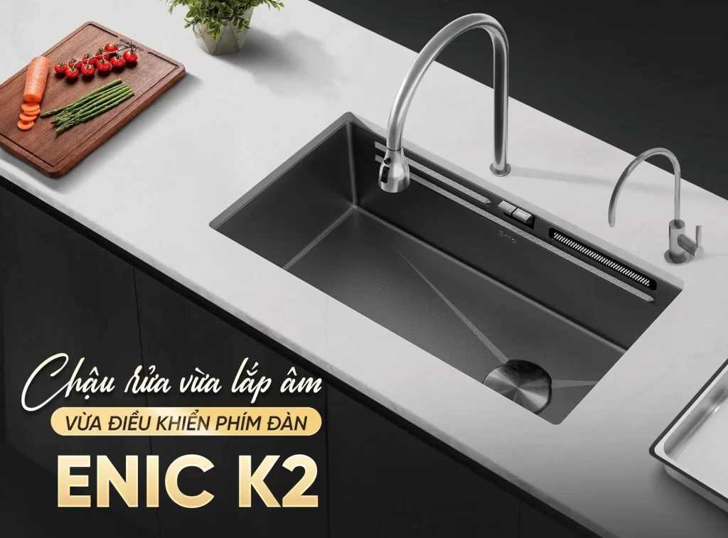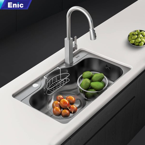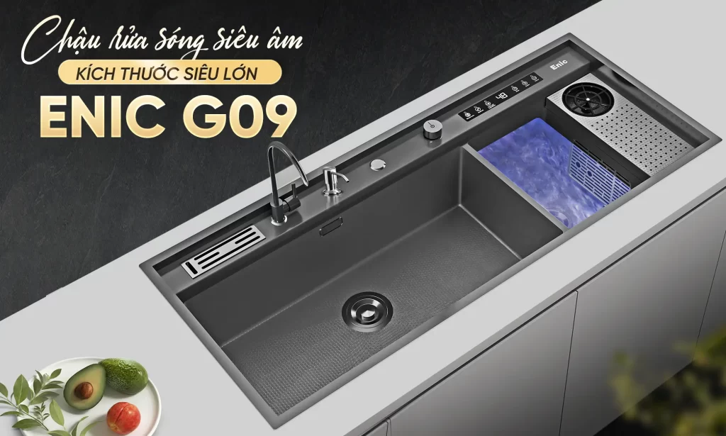 Các bồn rửa chén thông minh Enic, tích hợp công nghệ xúc tác nước kết hợp sóng siêu âm, giúp làm sạch thực phẩm chuyên sâu. Công nghệ này loại bỏ vi khuẩn, cặn bẩn và dư lượng hóa chất trên rau củ, thịt cá một cách hiệu quả, đảm bảo an toàn thực phẩm..