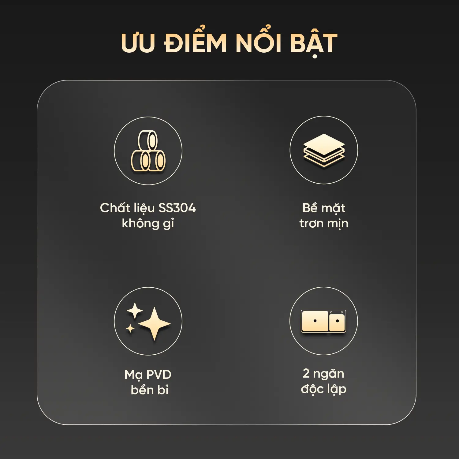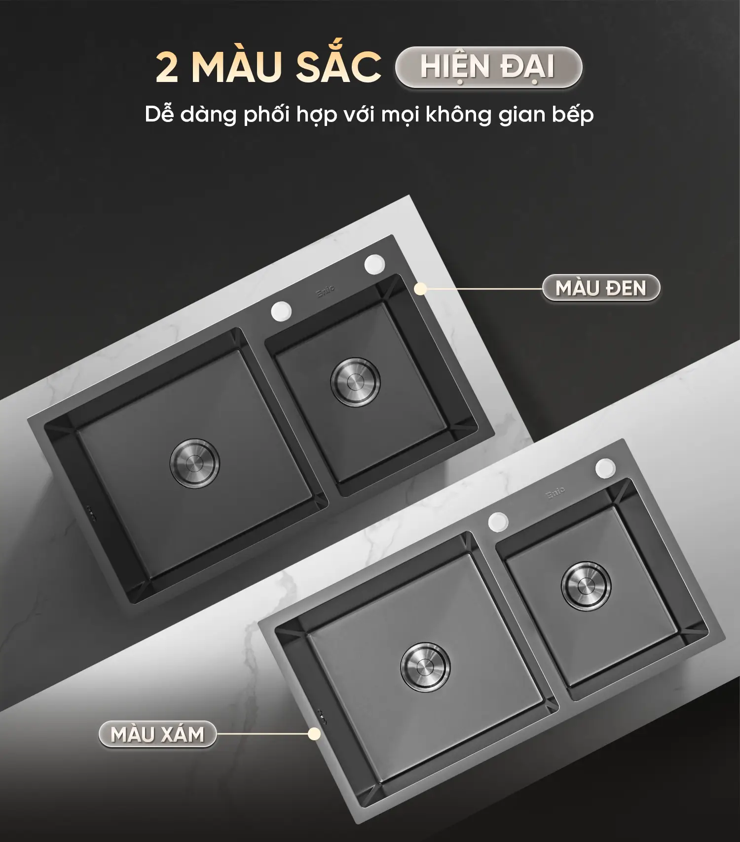 Màu sắc đẳng cấp: Sản phẩm có hai tùy chọn màu Đen và Xám, được xử lý bằng phương pháp mạ PVD cao cấp, không chỉ bền màu mà còn tạo nên vẻ sang trọng, tinh tế cho mặt bếp.