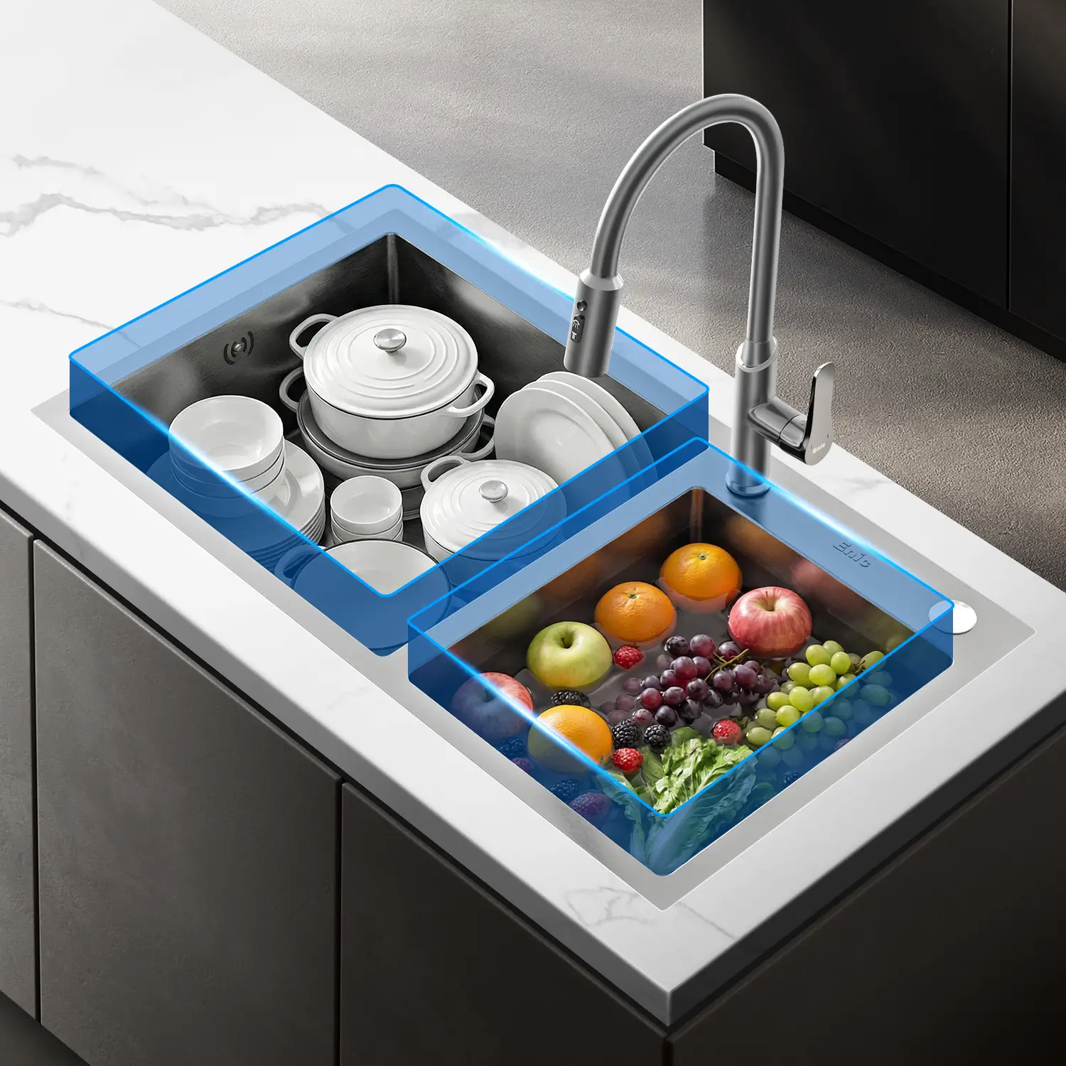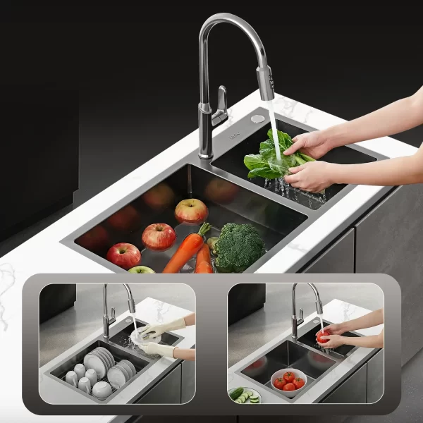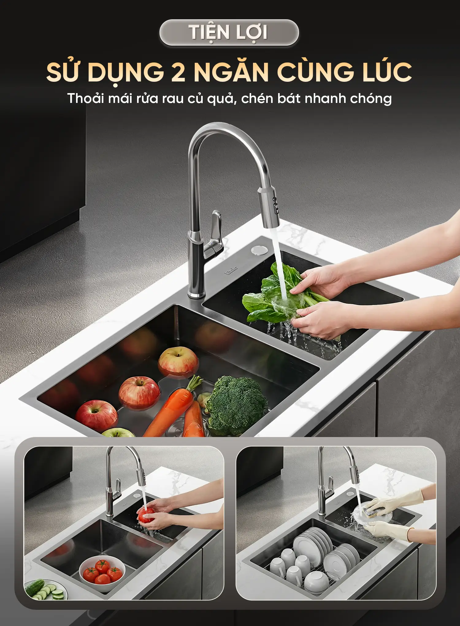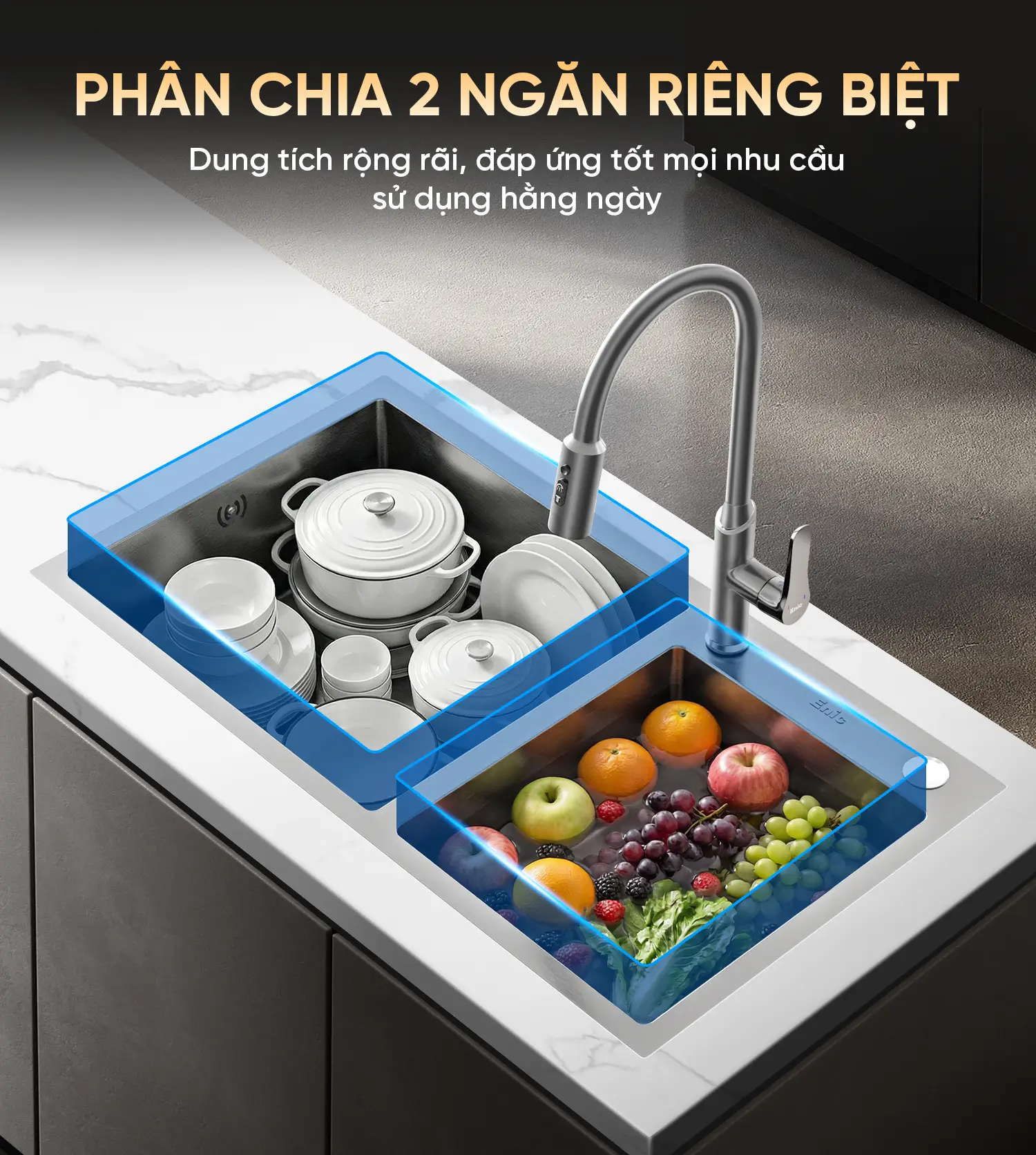 Hai ngăn tiện lợi: Giúp bạn dễ dàng phân loại công việc, ngăn chặn sự lây nhiễm chéo giữa thực phẩm sống và đồ dùng sạch.