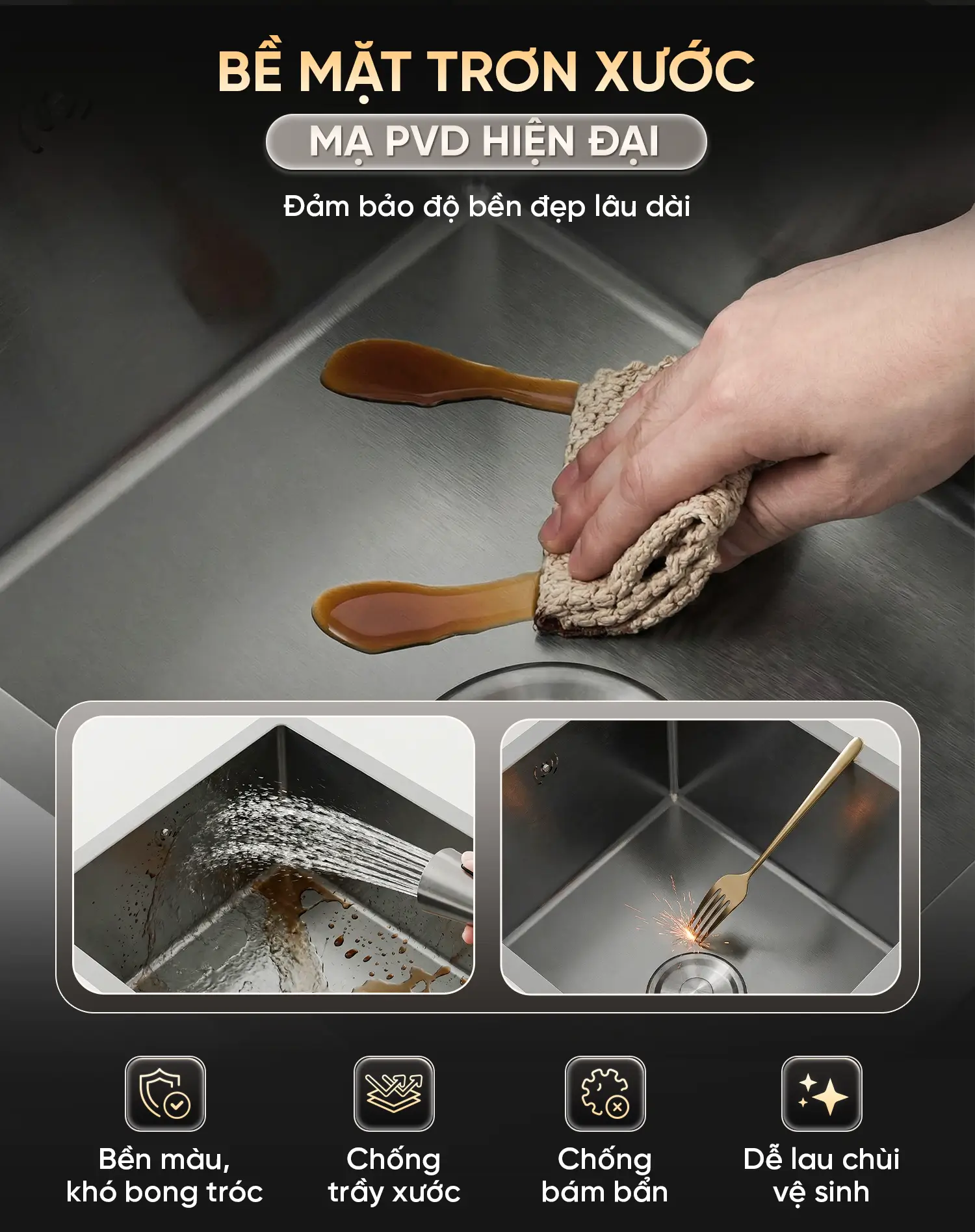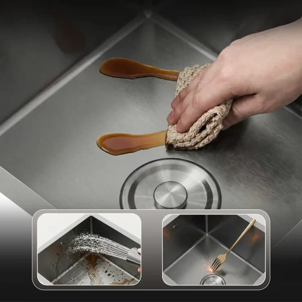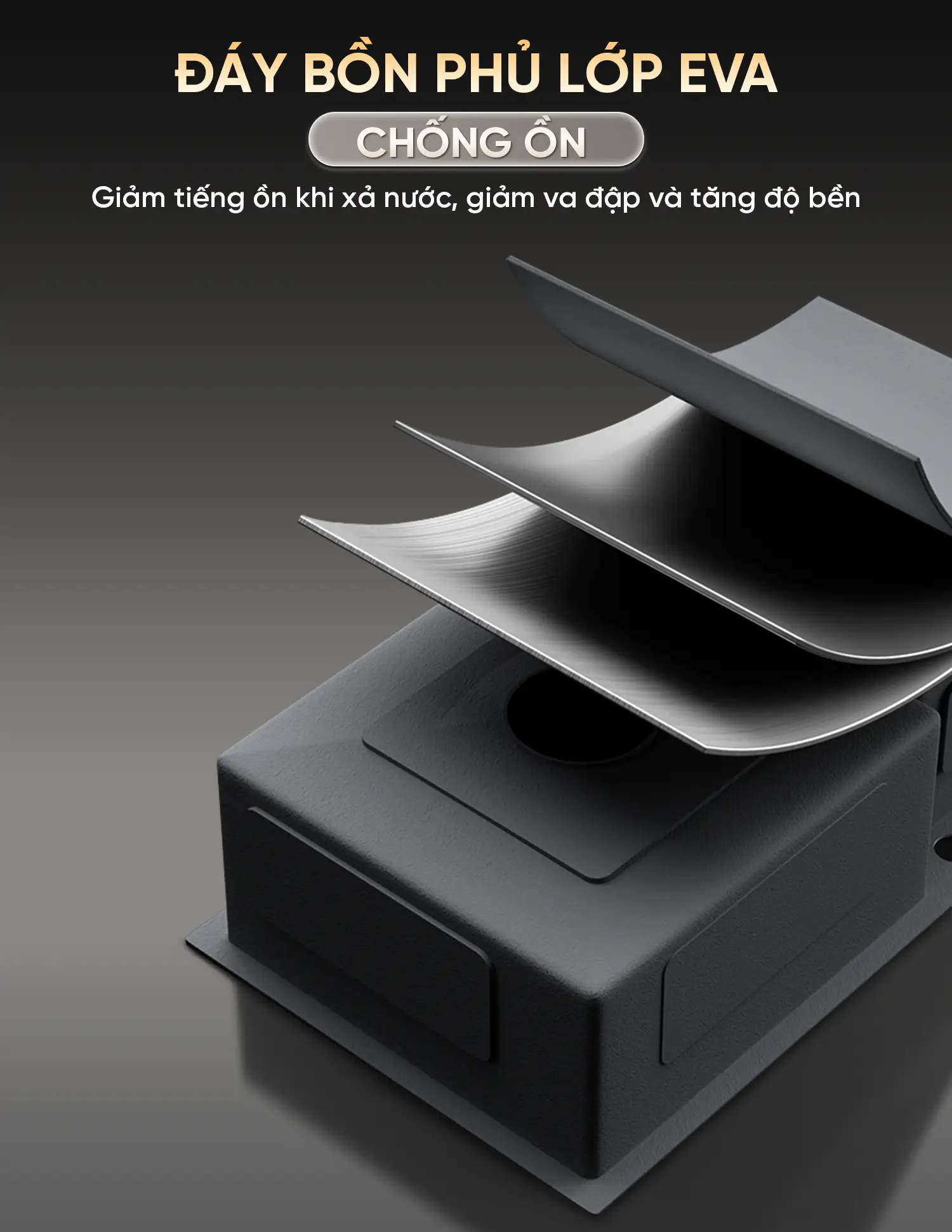 Lớp phủ EVA chống ồn: Dưới đáy bồn được trang bị lớp lót Eva đặc biệt giúp giảm thiểu tiếng vang khi xả nước hoặc va chạm bát đĩa, giữ cho không gian bếp luôn yên tĩnh và thoải mái.