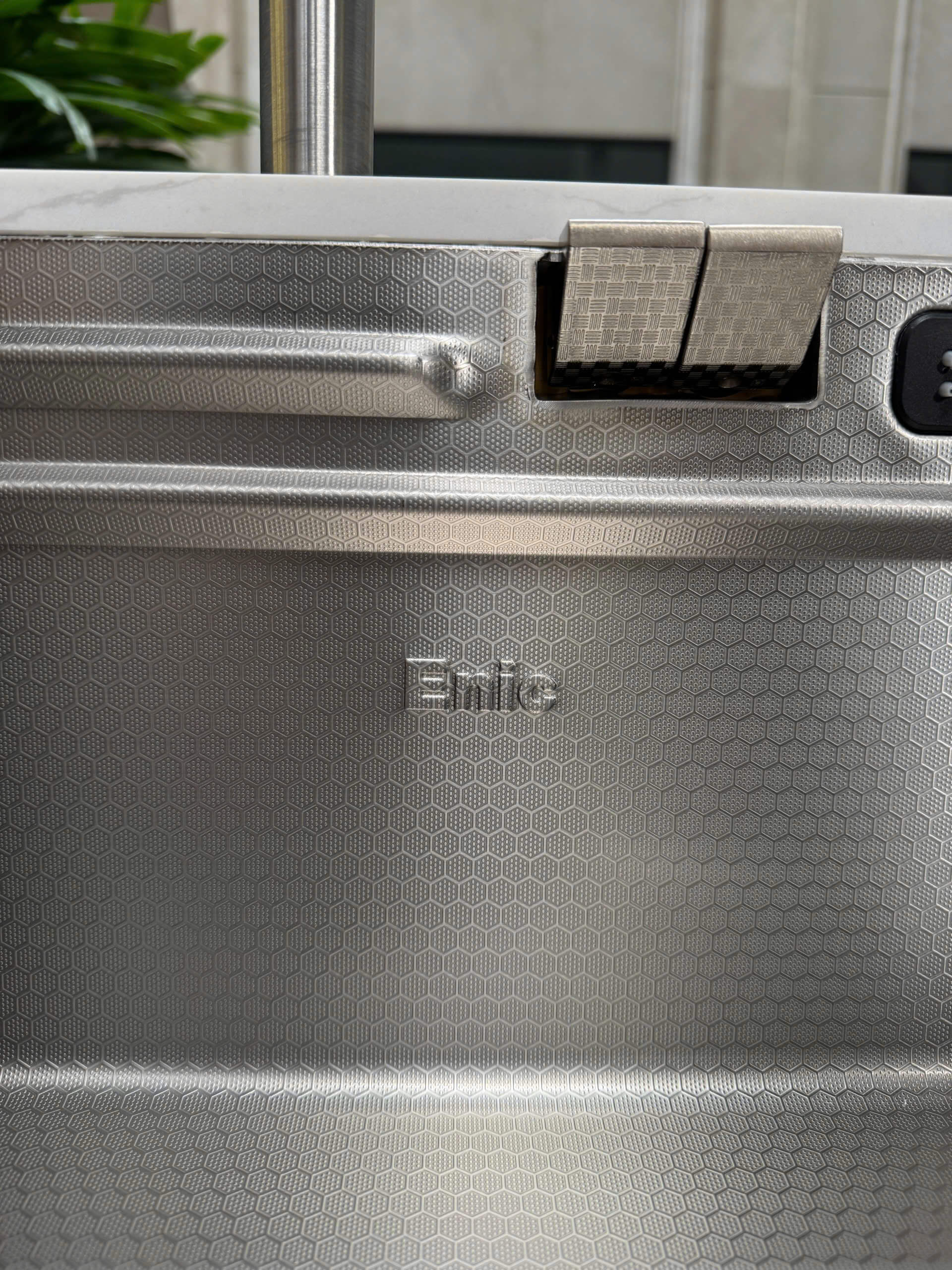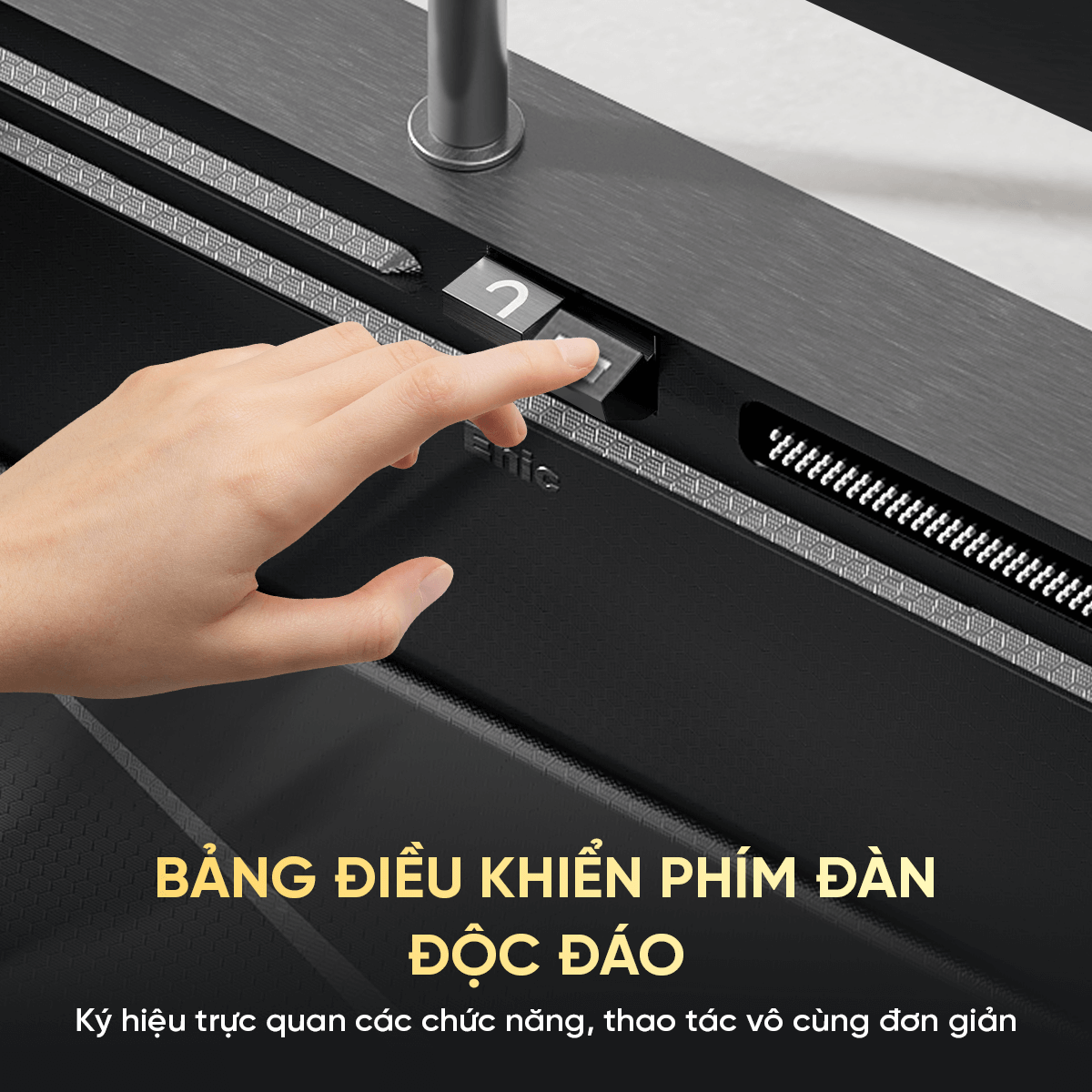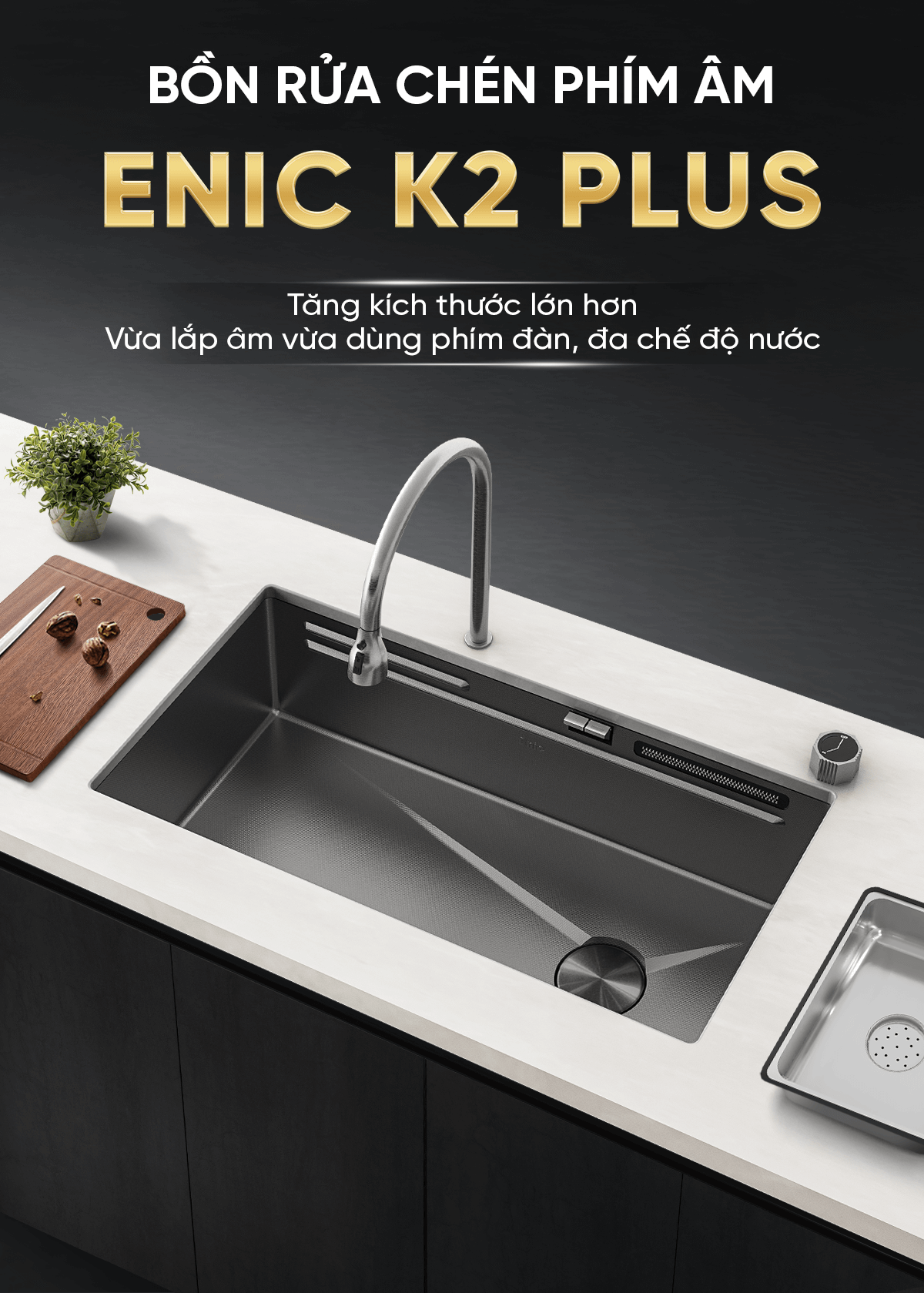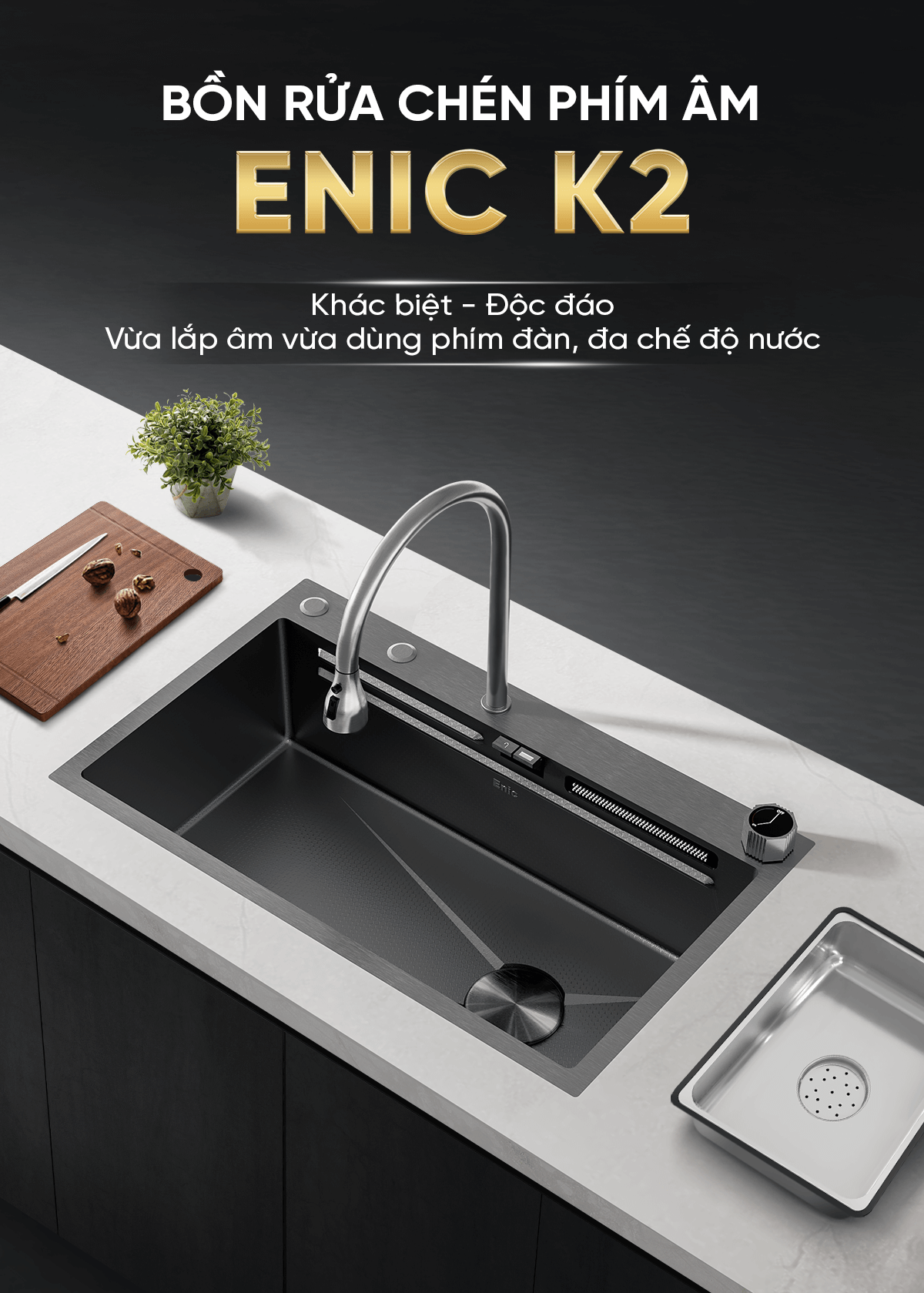 Đưa tính năng điều khiển thông minh vào khu vực dọn rửa với Bồn rửa chén Enic K2 Phím Âm – một bước tiến lớn trong dòng Thiết bị nhà bếp. Sản phẩm này không chỉ là một chiếc bồn rửa chén đơn thuần mà còn là một trạm sơ chế đa năng, tích hợp công nghệ phím đàn hiện đại ngay trên thành chậu.