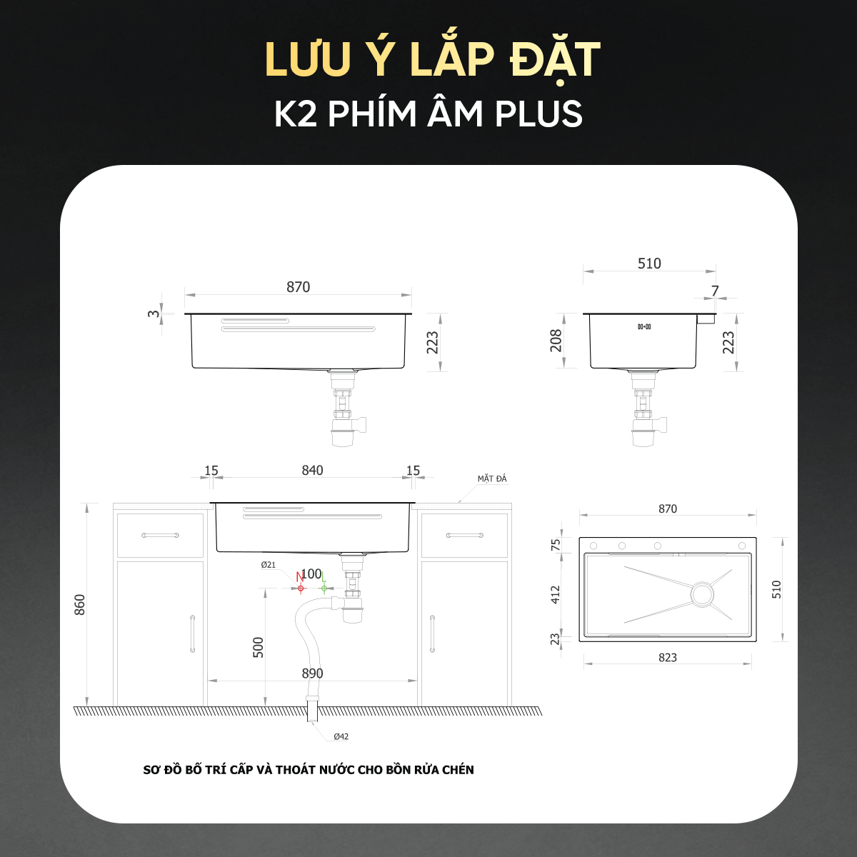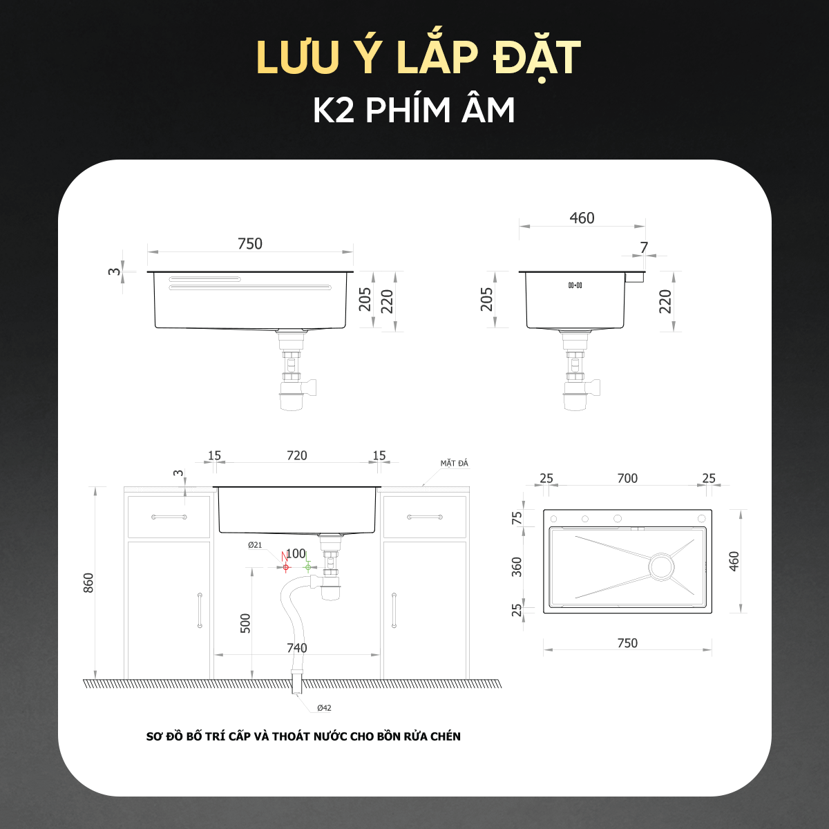 Bồn có thể lắp đặt bán âm hoặc âm bàn (kích thước khoét đá 720*440mm), tạo nên vẻ đẹp liền mạch cho mặt bếp. Bộ sản phẩm đã bao gồm đầy đủ xi phông ống xả và vòi bồn rửa chén đi kèm, giúp bạn lắp đặt và sử dụng ngay.